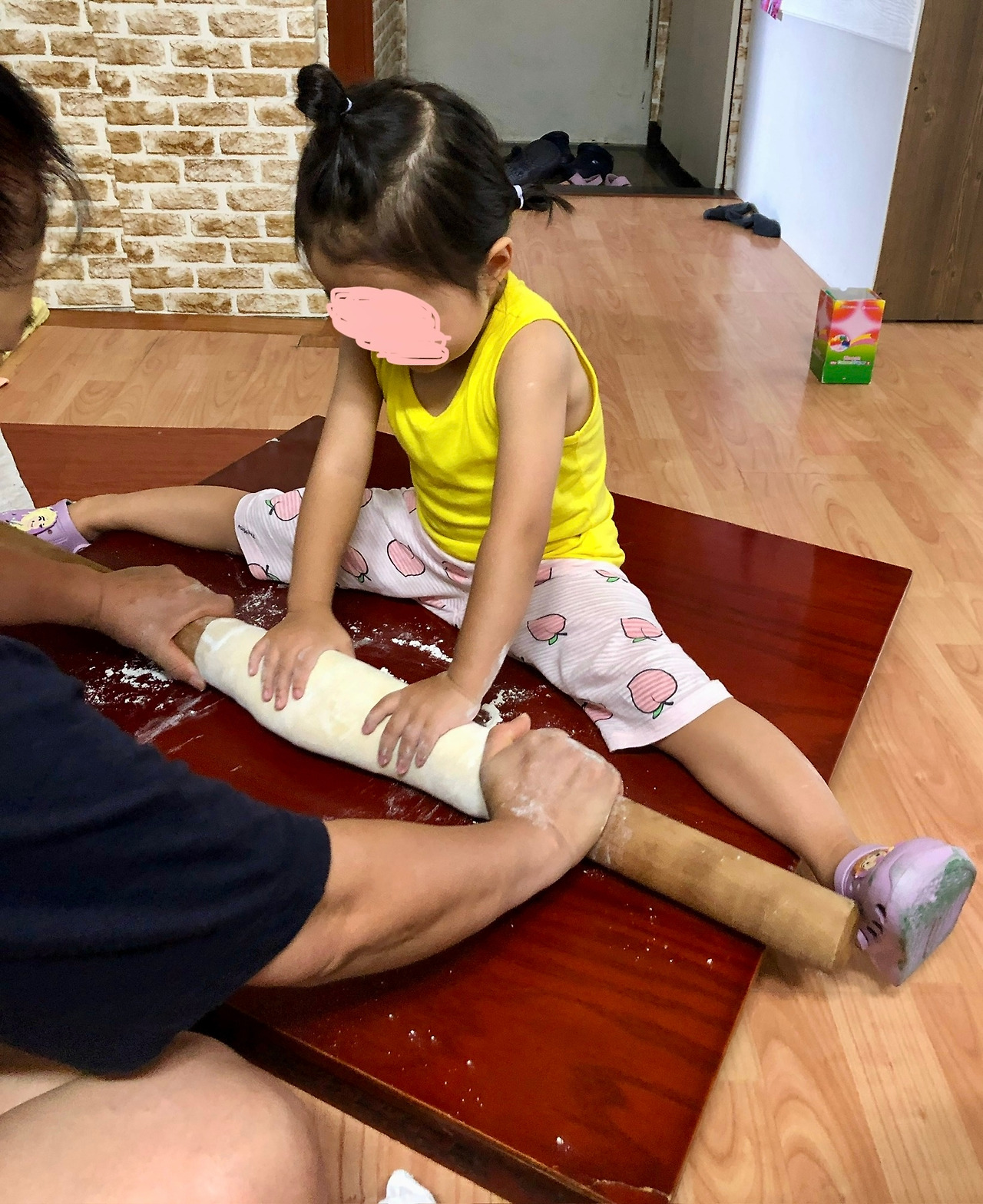 강아지는 당연히 오케이다. 그리하여 친정집 교자상 위에 뚱이가 올라가 앉고, 국수 장인처럼 할머니랑 마주 앉아 반죽을 밀고 또 미는 재밌는 장면이 연출되었다. 칼국수 면이 분칠한 채 가지런히 누워 마트에서 대기하는 요즘, 진짜 손칼국수는 참으로 오랜만이었다. 뚱이는 자기가 면을 직접 누르느라 너무 힘들었다고 엄살이었고, 가족들은 많이 웃었다.