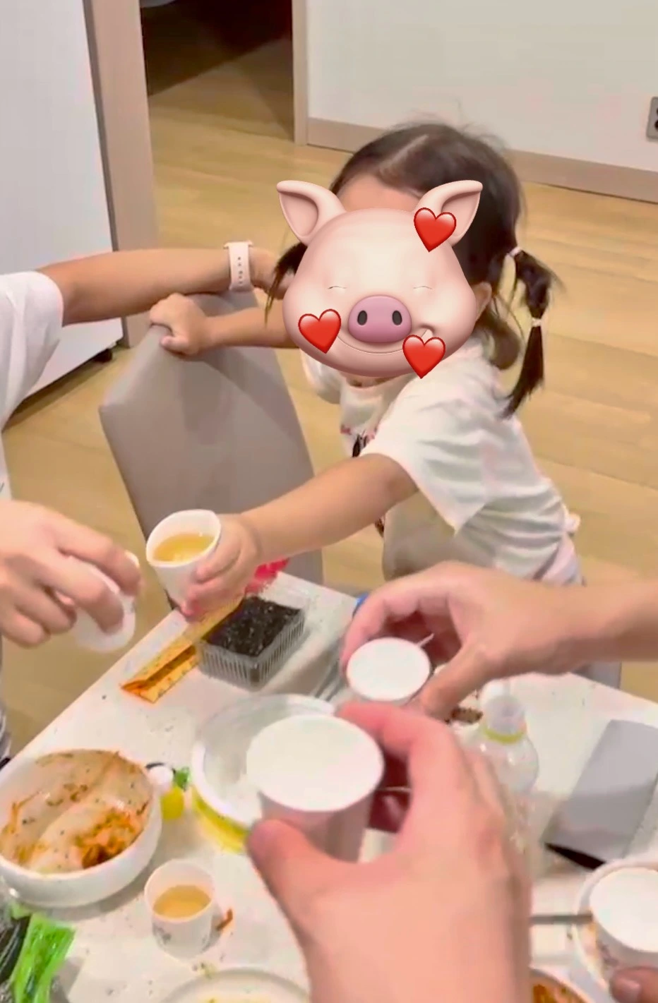 젖먹이였던 아기가 어느새 커서 이제는 건배사 전문가가 되었다. 자리에 맞게 준비된 멘트, 우렁찬 선창까지 정말 사회생활 n년차 부장님 같은 느낌이다. 우리 뚱 부장님께서 선호하시는 건배사 멘트는 주로 뚱아! (사랑해!) 내지는 우리 가족! (소중해!) 처럼 가족 모임에 어울리는 것들이다. 가족 중 누군가가 잔만 부딪히고 내려놓으면, 왜 안 마시는지까지 일일이 챙겨주신다.