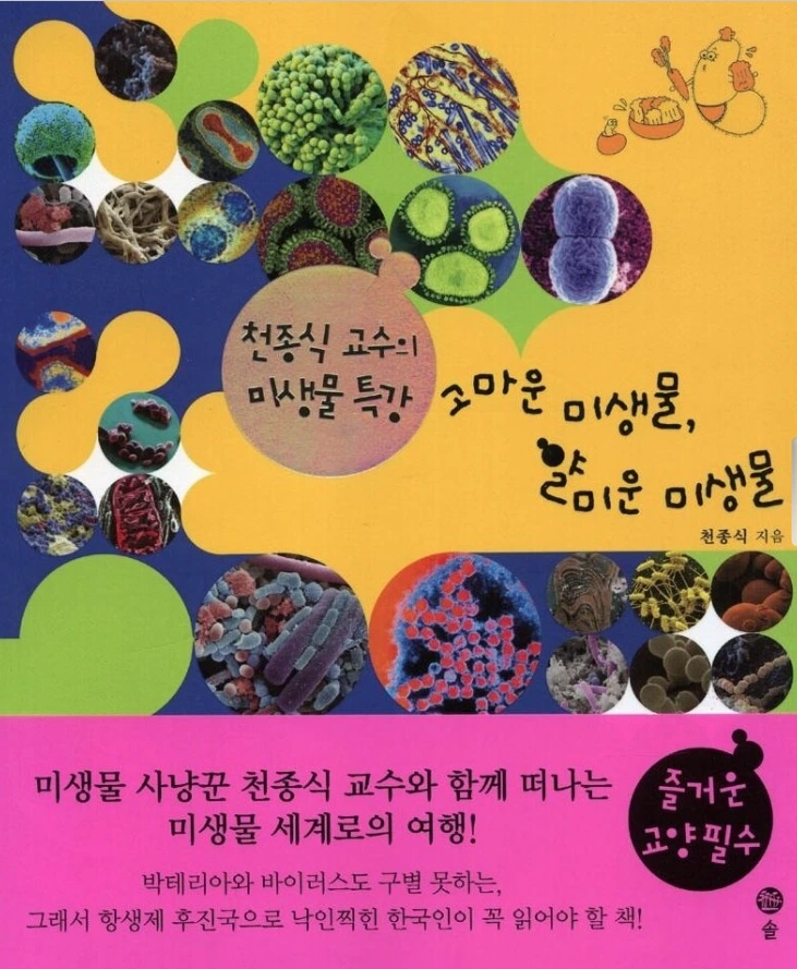 의기충천, 득의양양 독서모임을 시작해 여섯 번째 모임을 열고 순항 중이다. 이번 주 읽은 책은 <고마운 미생물, 얄미운 미생물>(2005. 천종식, 솔)이다. 이 책은 최재천 교수의 <통섭의 식탁>에서 가지를 친 도서이다. 미생물을 확대한 컬러 그림이 표지를 장식하고 있어 화려한 데다 제목은 어린아이를 위한 책처럼 정답기까지 하다. 게다가 목차를 보면 여섯 개의 주제 아래 빼곡한 작은 제목들, 각각 2,3쪽에 압축하여 내용을 정리한데다 다양한 그래픽이 거의 모든 페이지마다 들어 있어 실제 읽기에도 부담이 적다.
