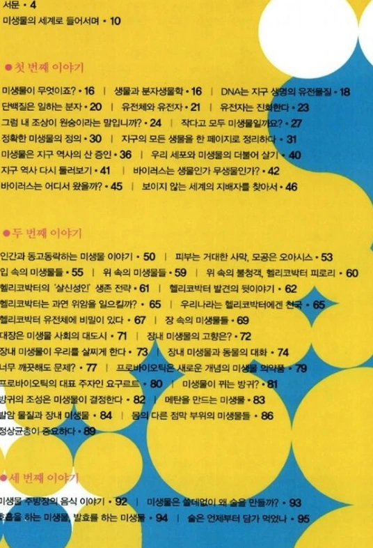책의 전반부는 인류에게 이로운 미생물을, 후반부는 인류에 해로운 미생물을 다루었다. 몸에 사는 미생물, 음식에 들어 있는 미생물, 미생물을 이용하여 만든 백신 등에 대한 이야기와 사스, 메르스, 광우병, 그리고 조류독감을 다루고 있다. 조류독감을 이야기를 할 때 코로나 바이러스를 다루고 있다. 최근 창궐하여 감염자 약 1억 명과 약 200만 명의 사망자를 낸 코로나19 이야기까지는 다루지 못하고 있다.
