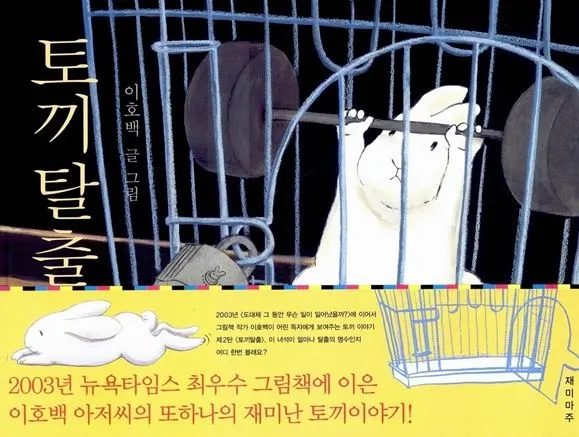 <토끼 탈출>은 사람들이 제한한 공간과 일에서 끊임없이 탈출하는 토끼에 대한 이야기입니다. 그래서인지 첫문장에서 “엄마! 우리 귀여운 토끼가 탈출했어요.”로 시작한다. 표지부터 쇠창살로 만든, 단단한 자물쇠로 채워진 토끼장과 그 안에서 역기를 들고 운동하는 토끼의 모습이 심상치 않아요.