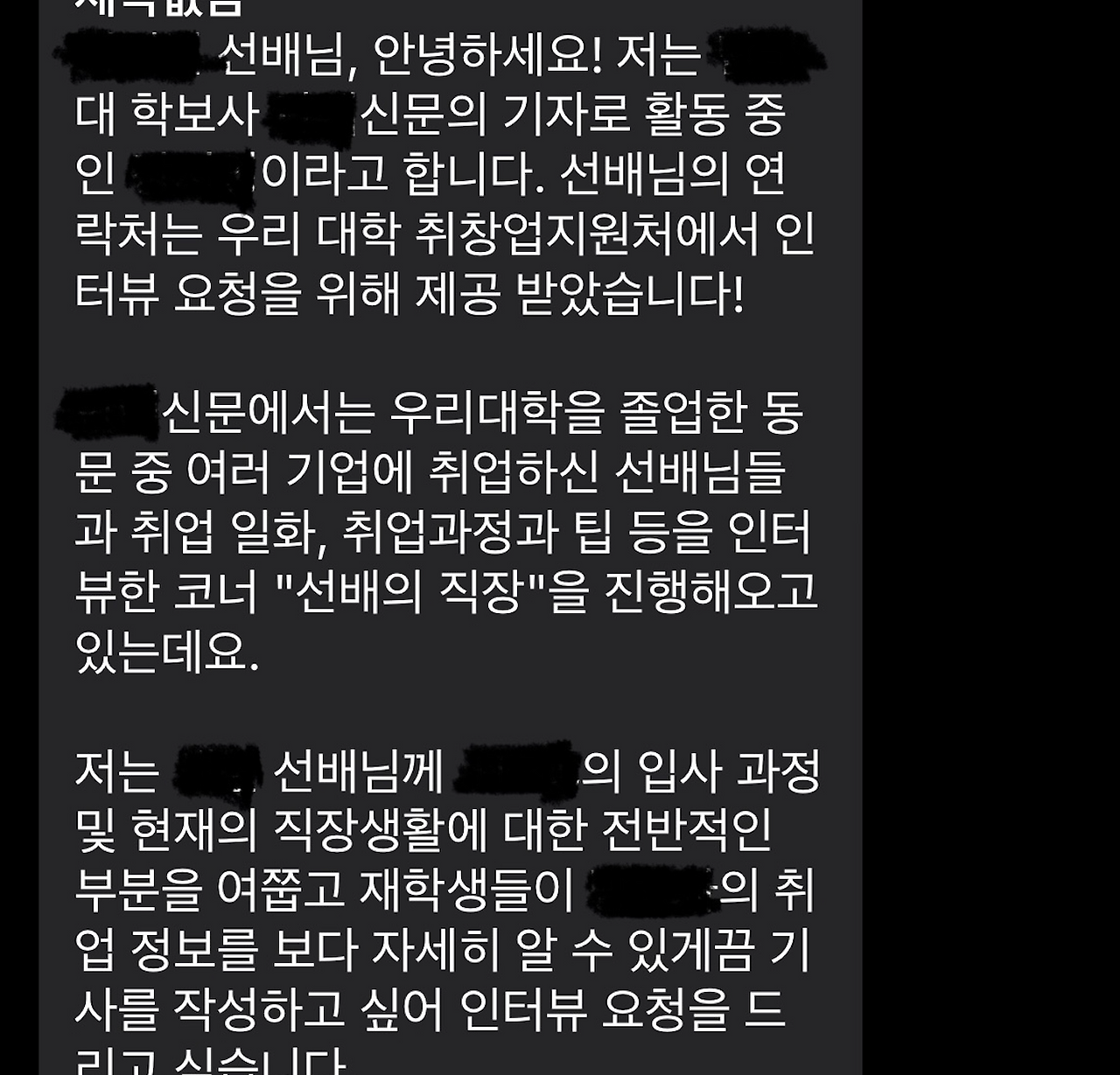2주 전 지방 일정을 마치고 숙소에서 쉬고 있는데 모르는 번호로 문자가 들어왔다. 보통 밤 늦게 문자를 보내는 건 보도자료를 송부하기 위한 노조들이고 이번에도 그럴 것이라 예측하고 아무런 생각없이 휴대전화를 열었다. 그런데 예상과 다른 아주 장문의 내용이었다. 특집 기사 인터뷰 요청을 위해 학보사 후배가 보낸 것이었다.