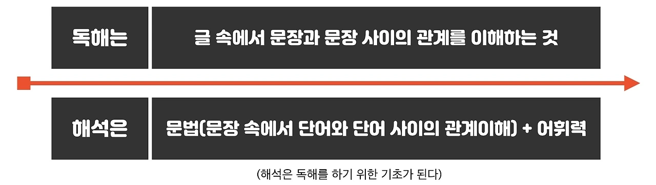 간단하게 말해서 해석은 독해에 가장 기본적인 요소이며, 해석을 바탕으로 전체 글이나 문단 속에서 문장들 사이의 관계를 파악하는 것이 독해라는 것입니다.