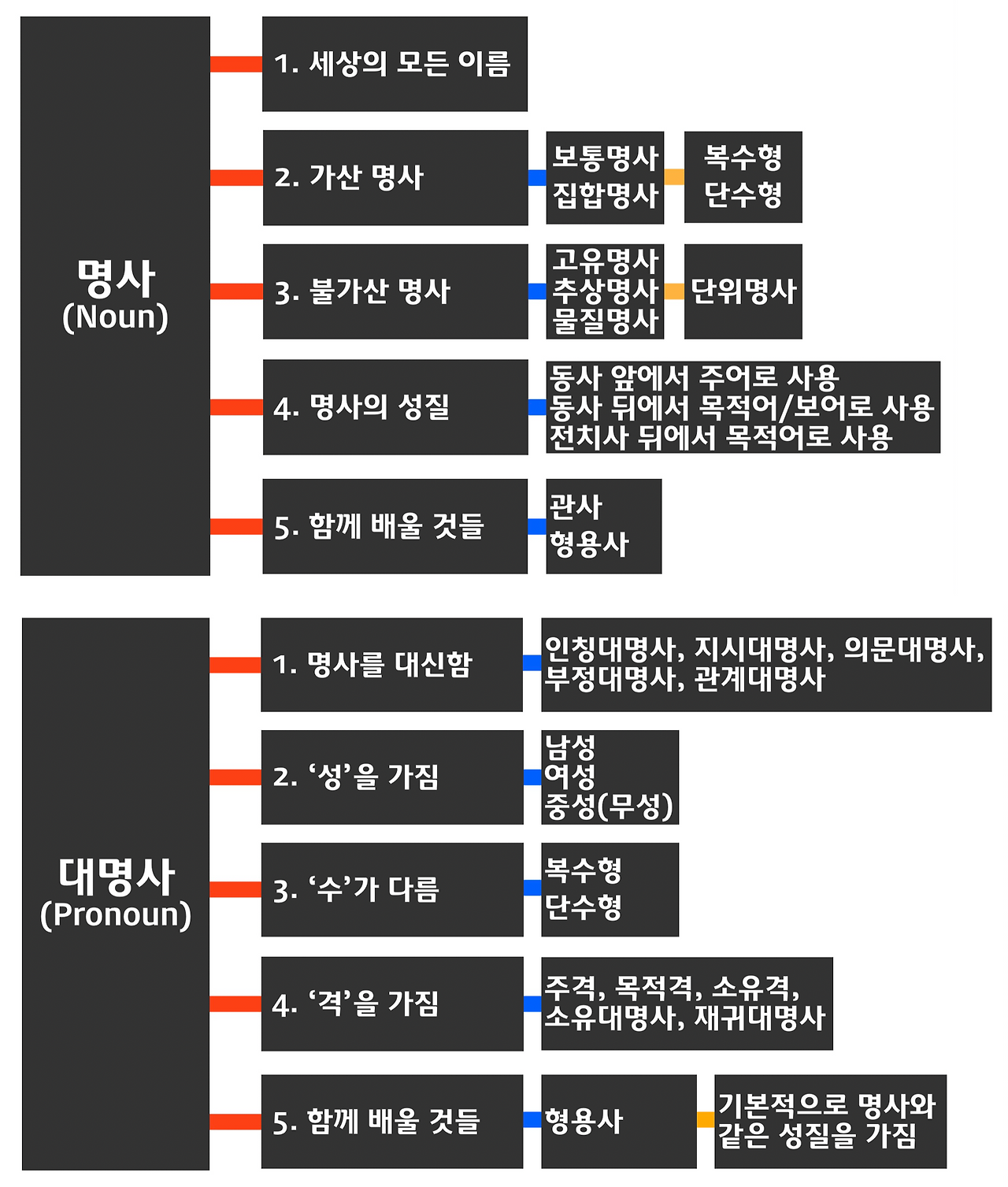 (다시 한 번 말씀드리지만, 이 책은 독해개념 이론서이기 때문에, 문법에 관한 내용은 핵심과 개념을 짧게 정리하는 의도로만 작성되었으며, 영문법을 한 번이라도 모두 훑어본 중학교 3학년 정도의 학생 이상의 분들을 위한 책이기 때문에, 각 문법별 자세한 내용은 다루지 않습니다. 그렇기 때문에, 아래의 각 품사에 대한 요약은 이미 배운 문법을 한 번 요약정리하는 목적으로 만들어진 표이며, 이 챕터의 후반부에서 문장 해석에 반드시 필요한 문법은 따로 정리하여 연습하도록 되어 있습니다.)