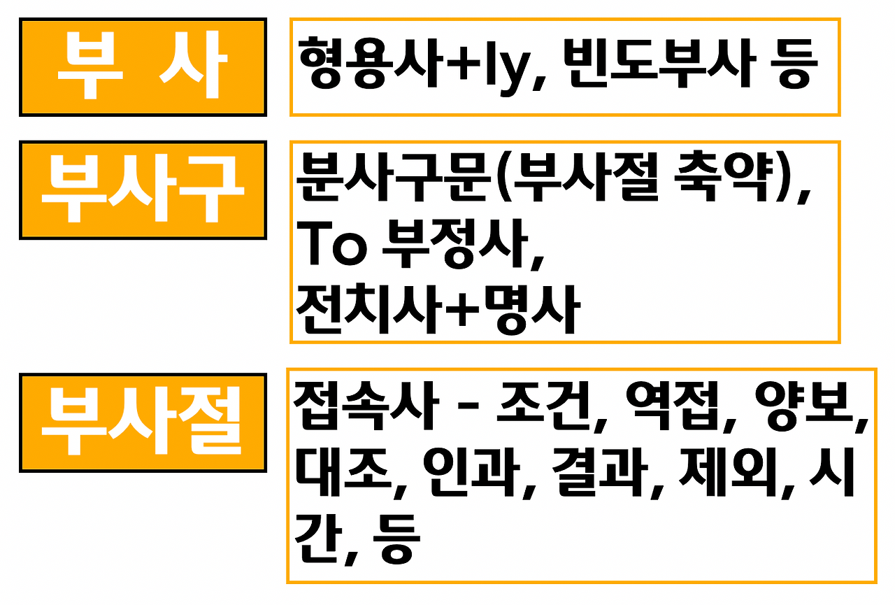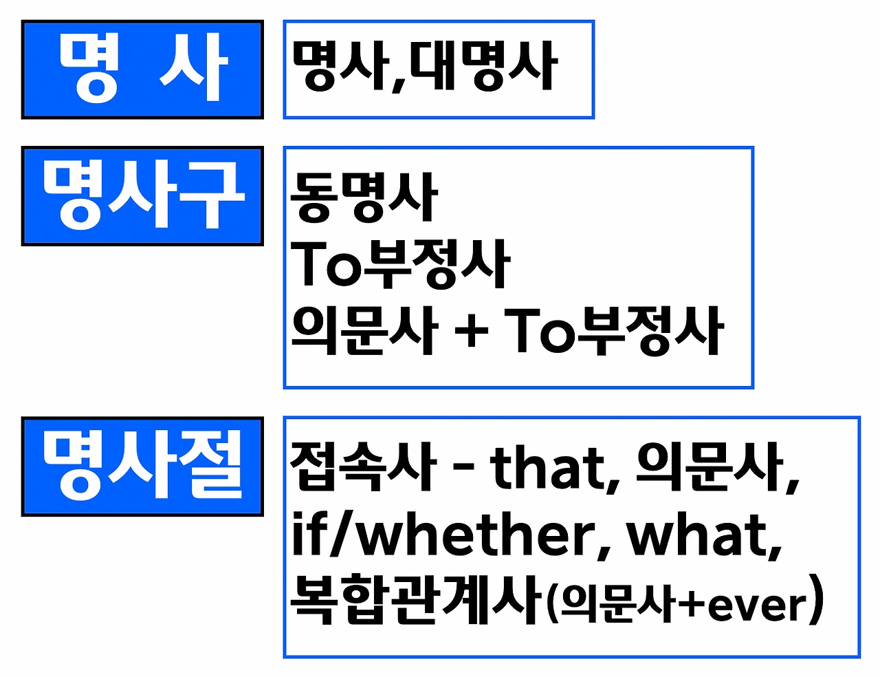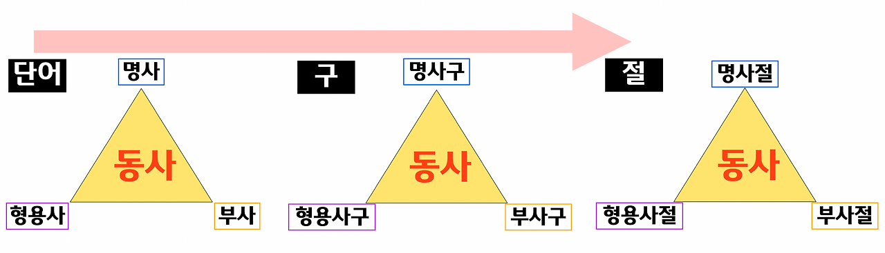 이와 같은 품사의 확장 개념(단어 -> 구 -> 절)을 간단하게 표로 나타내면 다음과 같습니다.
