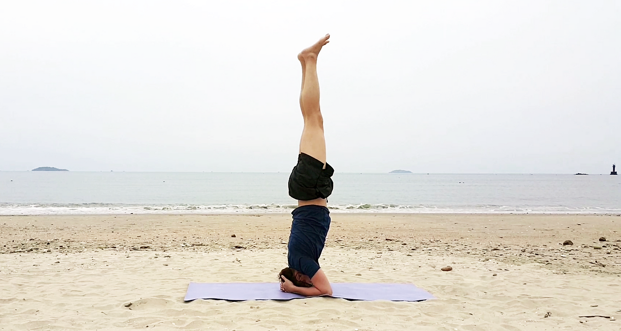 3개월 차에 성공한 머리서기 자세. 6개월 차인 지금은 1분 넘게 이 자세를 유지합니다.
