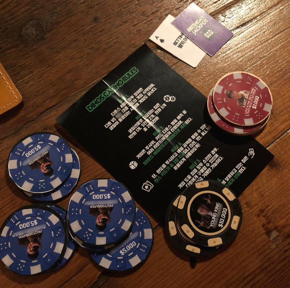 S는 도박, 아니 겜블, 아니 정확히는 배팅을 좋아하는 친구다. 겜블을 하러 여행을 하기도 하고, 운을 매우 중요하게 여기며, 에이스 카드를 무지 좋아하는 그에게 맞는 컨셉이라. 그럼 카지노 아니야? 'DIHOS CASINO' 어감이 꽤 괜찮은데? 움직이는 카지노 컨셉으로 함께 있는 시간을 기획하자. 그와 관련된 이미지와 텍스트로 칩을 디자인하고 그걸로 반나절 동안 겜블 또는 게임을 하면 재미있겠다고 의견을 모았다.