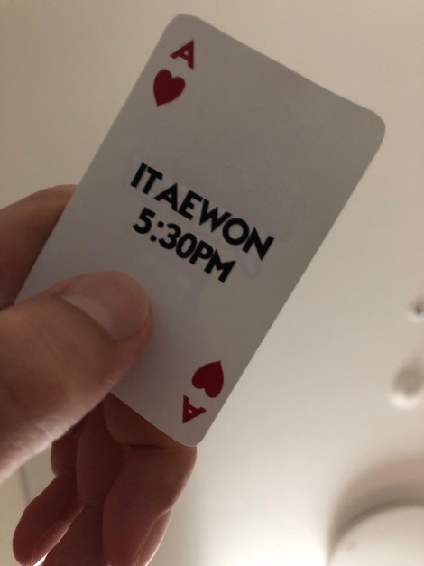 '게임'은 우리가 생일날 어디서 만날 지 정하는 데서부터 시작되었다. 생일 하루 전, 우리는 그에게 2개의 카드 중 하나를 뽑도록 하였다. 한 장의 카드에는 숫자 2에 그의 동네가 적혀있었고, 다른 한 장의 카드에는 A(에이스)와 회사가 있는 이태원이 적혀있었다. 그는 두 카드 중 에이스와 이태원이 적힌 카드를 뽑았다. 그는 그냥 그 카드가 에이스라는 사실에 실실 웃으며 좋아했다. 제일 낮은 패와 제일 높은 패 중에 제일 높은 에이스를 뽑았다며 좋아했다. 자기 집에서 먼 이태원이 만남의 장소라는 것을 알고 나서도, 에이스는 희생이 필요하다며 좋아했다. 에이스라 올 한 해 잘 풀리겠다며, K 하나만 더 있으면 블랙잭, 에이스 하나가 더 있으면 그냥 원페어와 차원이 다른 에이스 원페어, 숫자 8이 있으면 내추럴 나인이라는 둥... 정말 좋아했다. 자기 집 근처에서 만난다고 해도 자기는 카드 2를 뽑았으면 안절부절못하였을 거라며, '무슨 상황이든 에이스는 당당하지'라는 명언을 남기며 행복해했다.