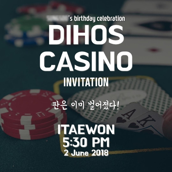 행사(?) 전 먼저 그의 기대감을 고조시키기 위해 '디호스 카지노'라는 컨셉으로 아래와 같은 포스터를 만들었다. 생일 당일날 우리가 만나기 3시간 전쯤 포스터 이미지를 단톡방에 미리 올렸더니, 그는 벌써부터 행복해하며 빨리 만나서 시작하고 싶다며 좋은 반응을 보여주었다. 나도 벌써부터 뿌듯한데... 실제로 만나서 칩까지 보여주면 얼마나 재미있을까라는 생각이 들었다. 빨리 만나고 싶더라.