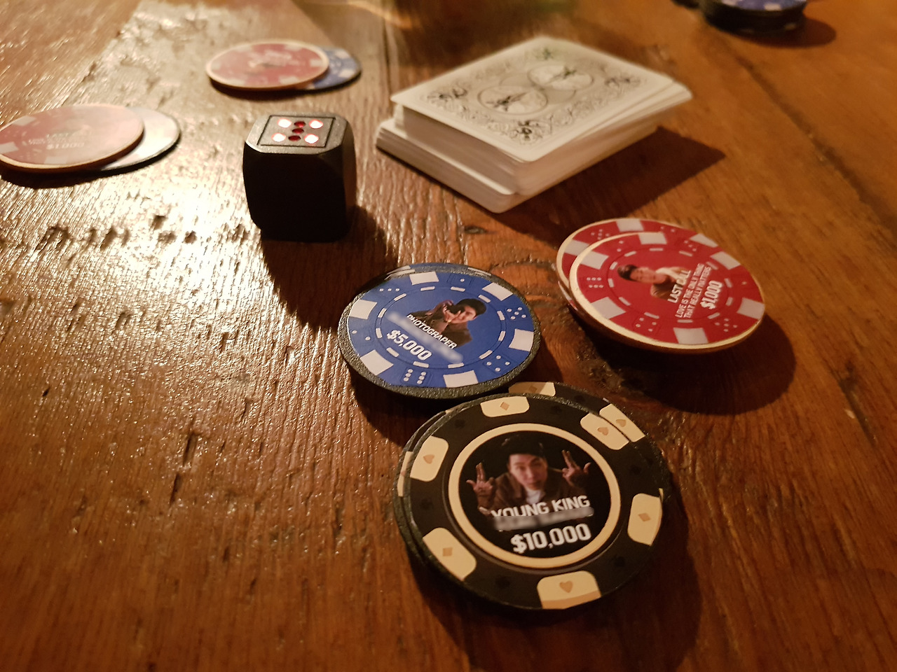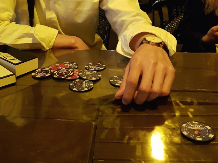 그는 그 든든해진 칩으로 가위바위보, 묵찌빠, 탕수육, 물컵에 넘치지 않게 물 따르기 등의 게임들을 통해 다시 총 7만 원가량의 칩을 확보했으며 다시 자신감을 회복했다. 역시 그는 겜블러였던 것이다. 그리고 마지막에 갔던 바에서는 게임을 허락하지 않아서... 추후 다시 게임을 재개하기로 하였다. 만약 현금으로 환전한다면 그는 2만 원가량의 생일 선물을 받는 거겠지. 오후 5시 반부터 시작하여 반나절을 겜블링과 함께 보냈는데, 이게 뭐라고 너무 꿀잼이었다. 친구는 분명 즐거워했다. 그의 얼굴이 박혀있는 실물 칩과 카드, 주사위 등은 그에게 돈보다 더 큰 만족감을 안겨줬고, 그의 즐거워하는 표정은 우리도 즐겁게 만들었다.