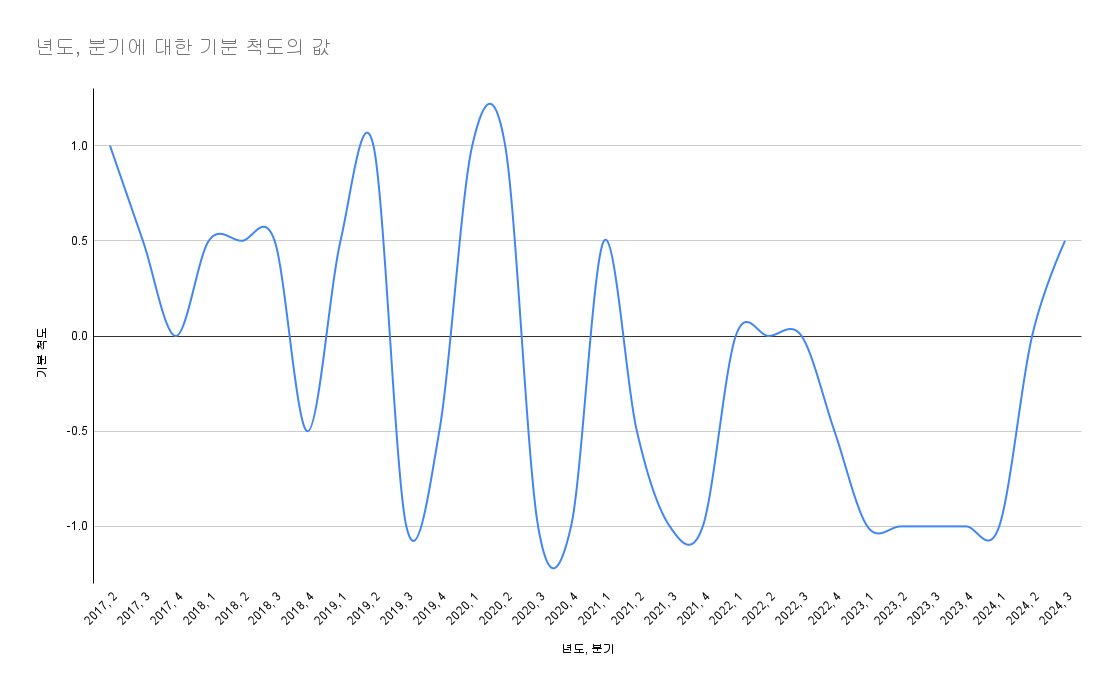 일기를 참고로 하여 2017년부터 현재까지, 분기별로 기분 점수를 매겨 보았습니다. 편의상 평범한 상태를 0, 경조증은 0.5, 조증은 1, 가벼운 우울증은 -0.5, 심한 우울증은 -1의 값을 상정하고, 구글 시트에 데이터를 입력하여 차트로 출력했습니다. 그 결과는 다음과 같습니다.