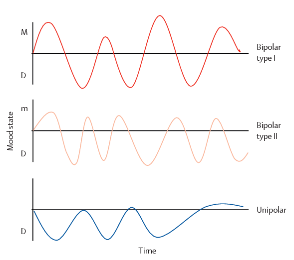 위로부터 양극성 장애 1형의 경우 조증이 적어도 1번 이상 명확하게 나타나는 특징이 있고, 두 번째 양극성 장애 2형의 경우 적어도 1번 이상의 경조증과 1번 이상의 우울증이 나타납니다. 세 번째 그림은 단극성 우울증(우리가 일반적으로 우울증이라고 부르는 그것)의 기분 변화 그래프입니다. 보시다시피 기분이 가라앉은 상태만 반복적으로 나타납니다.