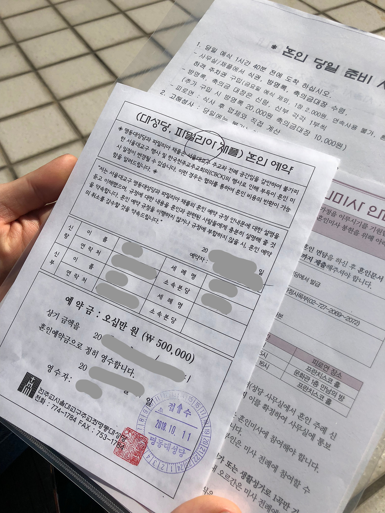 명동대성당 예식 가격이 파밀리아 채플의 2배라는 점은 조금 걱정이었지만 가족과 상의 후 정한 결혼식 날짜가 두 날짜밖에 없었어서 어느 장소든 날짜가 비어있기만을 바랬다.