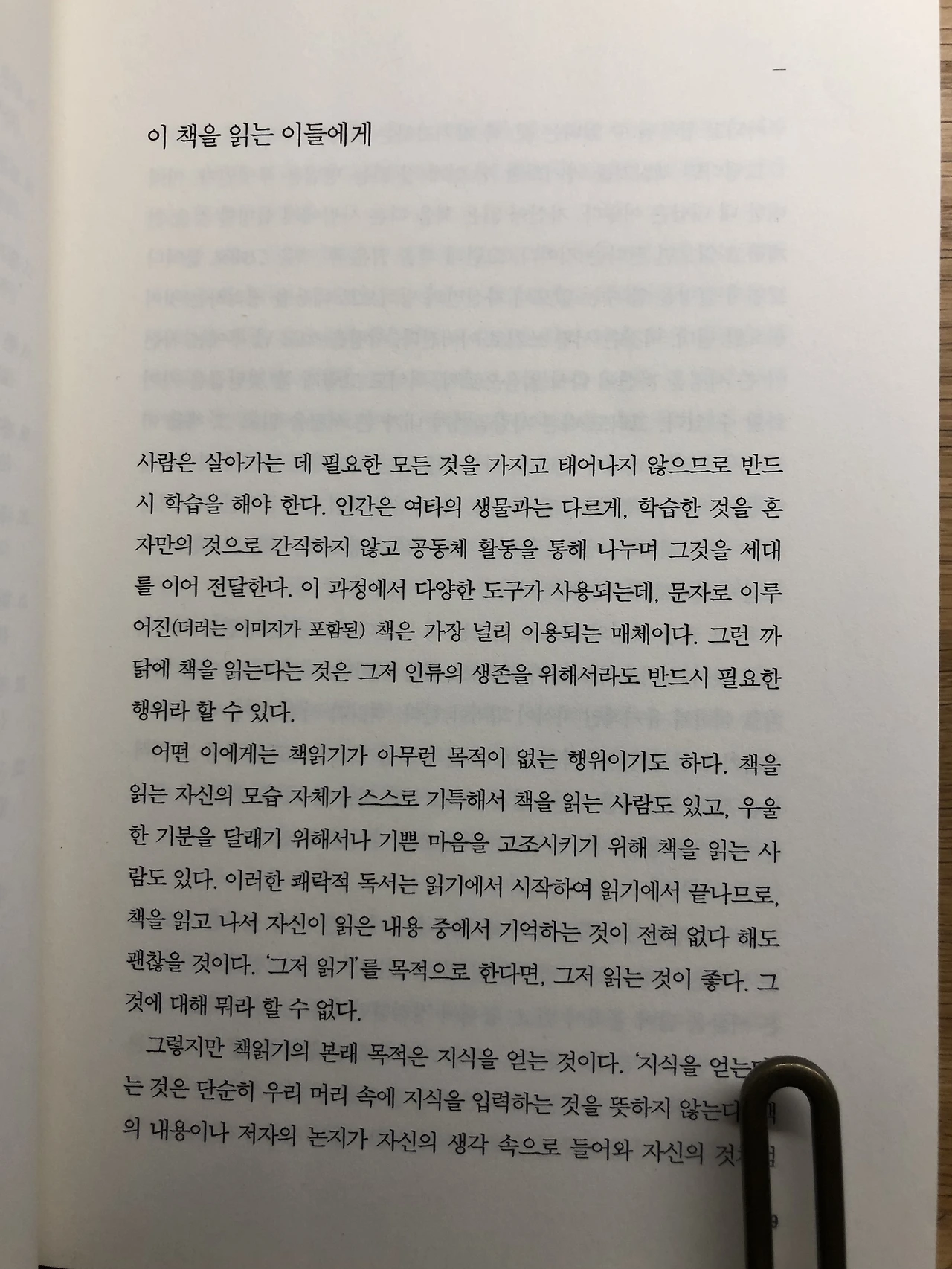 서문은 '이 책을 읽는 이들에게'라는 제목으로 독서하는 이들에게 독서의 궁극적 목적이 무엇인지 말하고 있다. “책 읽기의 본래 목적은 지식을 얻는 것”인데 “'지식을 얻는다'는 것은 (…) 자기화하는 것까지 의미”한다고 서술하고 있다. 단순히 ‘읽기’라는 행위를 넘어 “지식 탐구라는 목적”으로 나아갈 수 있음을 시사한다. 이 대목에서 자신이 왜 책을 읽는가에 대해 깊이 생각하고 넘어가야 한다. 그 목적이 바로 서지 않으면 진정한 책 읽기 즉 “책 읽기를 통해 체계적인 지식과 지속적인 교양을 쌓”는 단계로 넘어갈 수 없다.