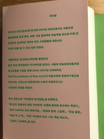 이 책은 곽아람 씨가 20년 전 대학 생활을 회고한 책이다. 전공은 고고미술사학과. 국어 교육을 전공하는 너와는 결이 다르다고 생각할 수 있겠지만 저자가 공부에 임하는 자세, 마음가짐, 그리고 20년 전 공부가 현재 저자에게 어떤 영향을 미쳤는지에 초점을 맞추어 읽으면 도움이 될 거라 믿는다.