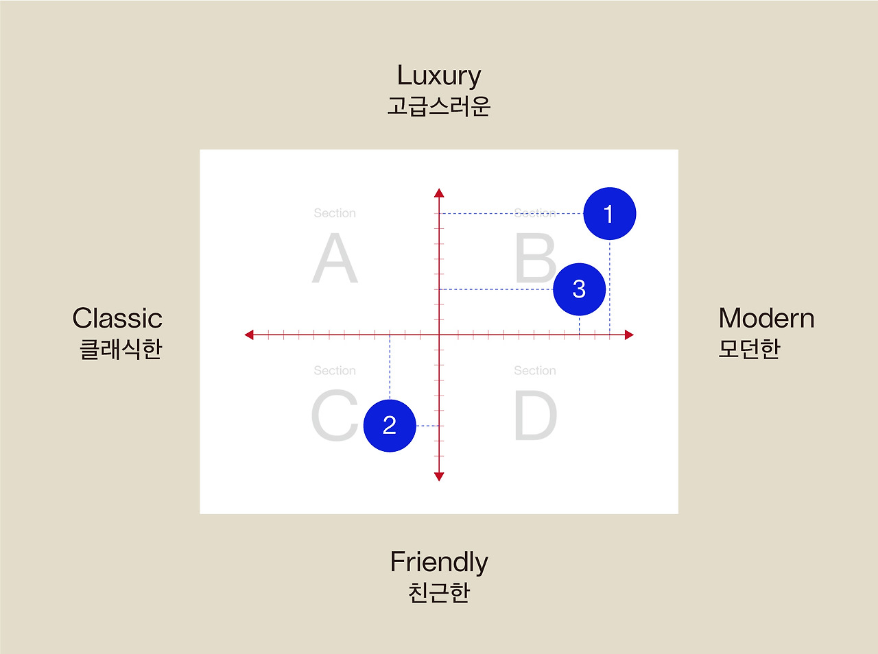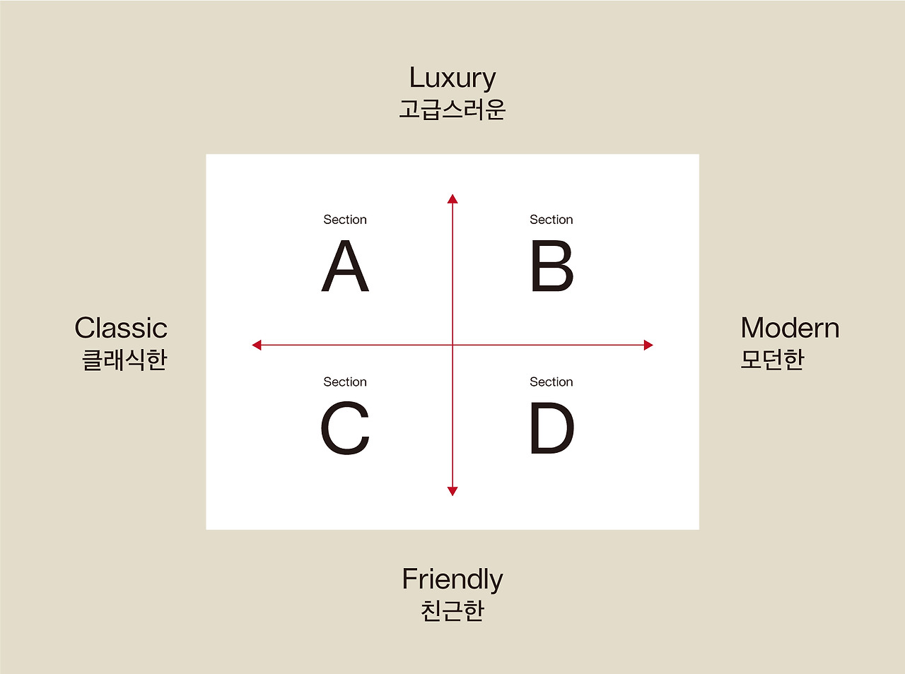 처음에 우리가 생각했던 방향은 우측상단의 (B Section) 이었습니다. 고급스럽고 모던한 홈 라이프스타일 브랜드가 되어야지! 라고 마음먹었던 것과는 다르게 인스타그램이 망가지면서 지난주에 부부의 의견충돌이 잦아졌습니다. 서로 10년이상 각자의 영역에서 프로(Professional)인데 소통하는것이 무척 어려웠습니다. 처음엔 이 사실조차도 서로 인정하기 어려웠습니다. 그래서 이 자료를 만들었다구요...하아..그동안 회사는 어떻게 다닌걸까..?