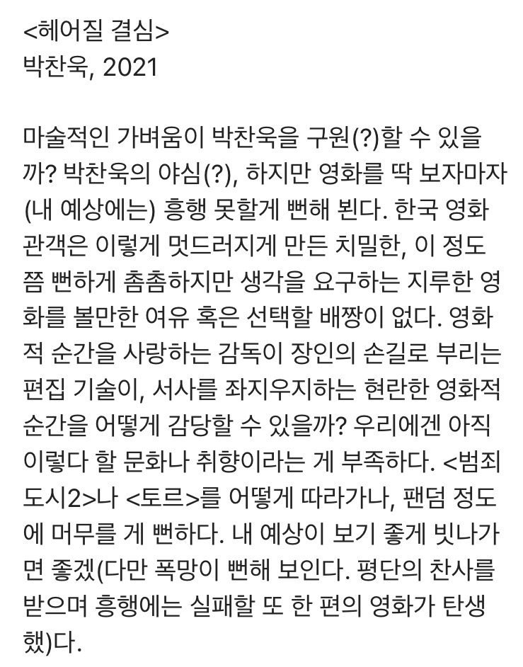 영화가 개봉하고 난 다음 주 월요일, 그러니까 한 주전 수요일 개봉한 <헤어진 결심>을 개봉 6일(7/4)째 보고 나오자마자 카카오 스토리에 올린 글이다. 브런치에 다시 글을 쓰려고 방금 Daum 영화 정보에서 관객수를 보니 92만 후반 대다. 예상이 맞아간다, 박찬욱은 어쩌나? 쓸데없는 게 연예인 걱정(손익분기점은 해외 판권 선판매로 이미 확보했단다)인데 말이다. 칸에서 감독상도 받았겠다, 박찬욱 영화가 15세 이상 관람가도 받았겠다, 영화 흥행을 끌올 하기 위해 여러 매체 인터뷰에서 박찬욱은 흥행 대박을 꿈꾸고 염원했다. 하지만 바람도 무색하게 멀티플렉스에서 <헤어질 결심>의 상영 시간과 회차는 숨 가쁘게 사라지고 있다. "봉준호와 김지운에게 박찬욱이 술 살 날"은 이렇게 물 건너간다. <헤어질 결심>의 흥행은 어쩌면 이렇게 박찬욱스러운가? 박찬욱의 운명(?)이 얄궂다. 배짱을 부릴 수도 버릴 수도 없는 박찬욱의 골치 아픈 딜레마는 골이 깊어만 간다. 박찬욱은 영화 평론이라는 글로 영화 이력을 시작했다는 사실을 기억해야 한다.