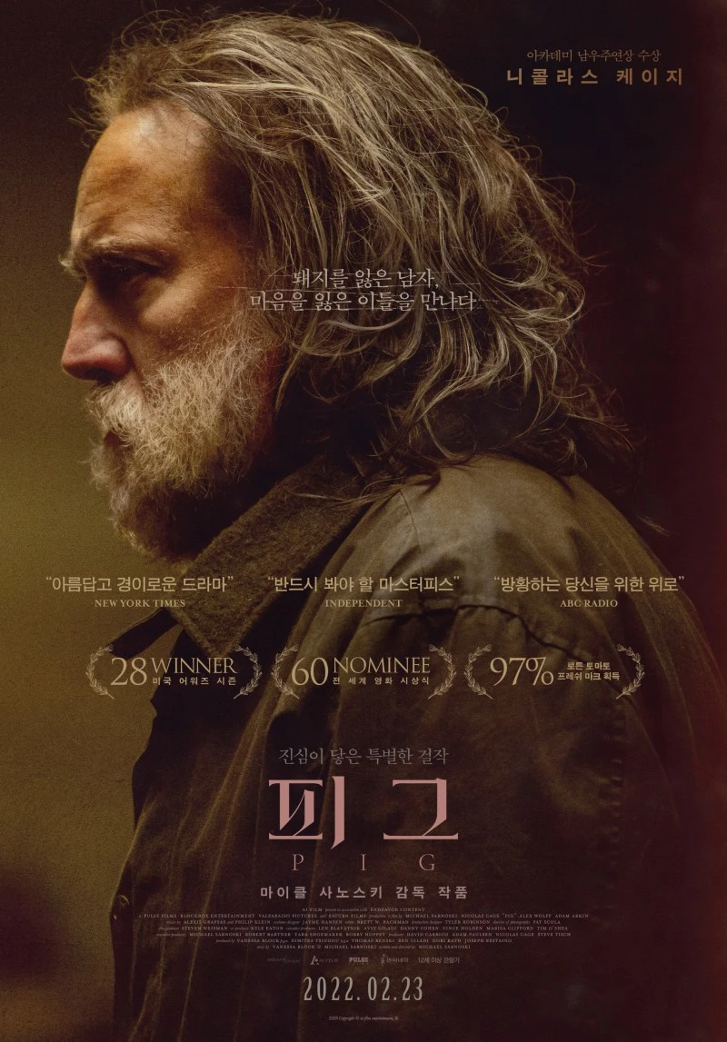 영화 <피그>는 솔직하고 정직하며 진솔하고 단단하다. 게다가 세련되면서도 어른스럽다. 이런 좋은 영화 현재 관객수가 고작 11,726명이 전부다. 이게 시퍼렇고 서글픈 현실이다. 하지만 세계 유수의 9개 영화제는 9개의 연기상을 그에게 안겼다. 영화 <피그>를 통해 니콜라스 케이지가 보란듯이 영화적으로 연기적으로 재기했다.