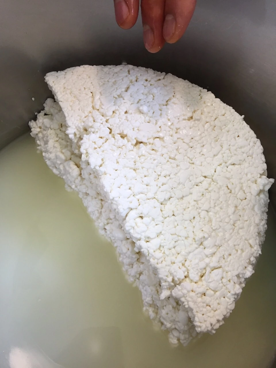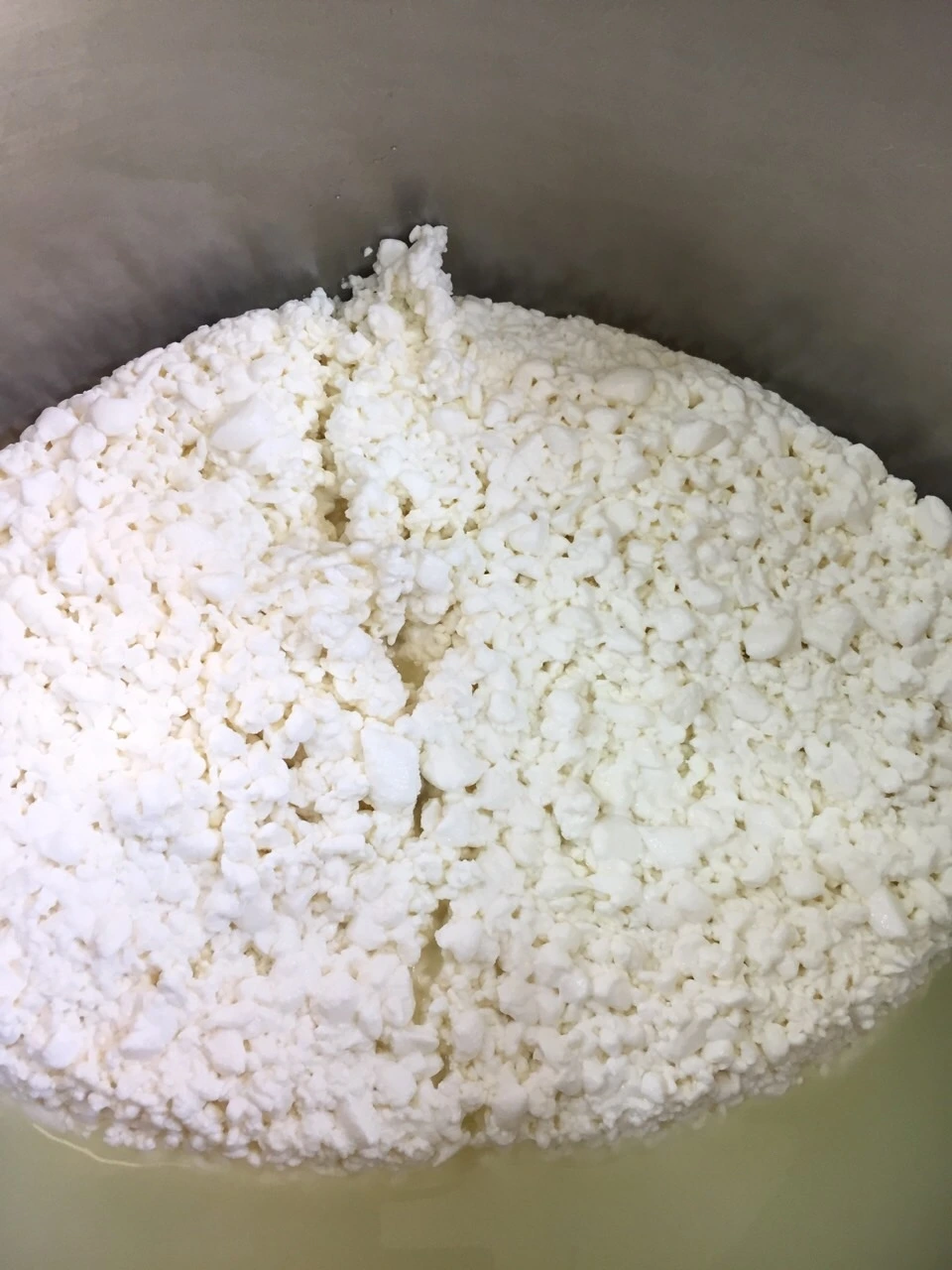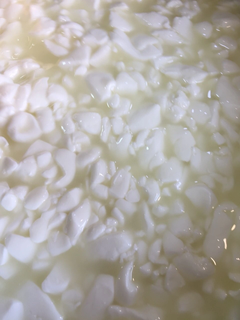 11. 체더링 한다. 온도는 중탕수 39°C 를 유지한다. 반으로 잘라 포개고 뒤집기를 10분 간격으로 바글거리는 콩알 커드가 한덩어리로 붙을때까지 반복한다. ph 5.4까지 체다링을 진행한다.