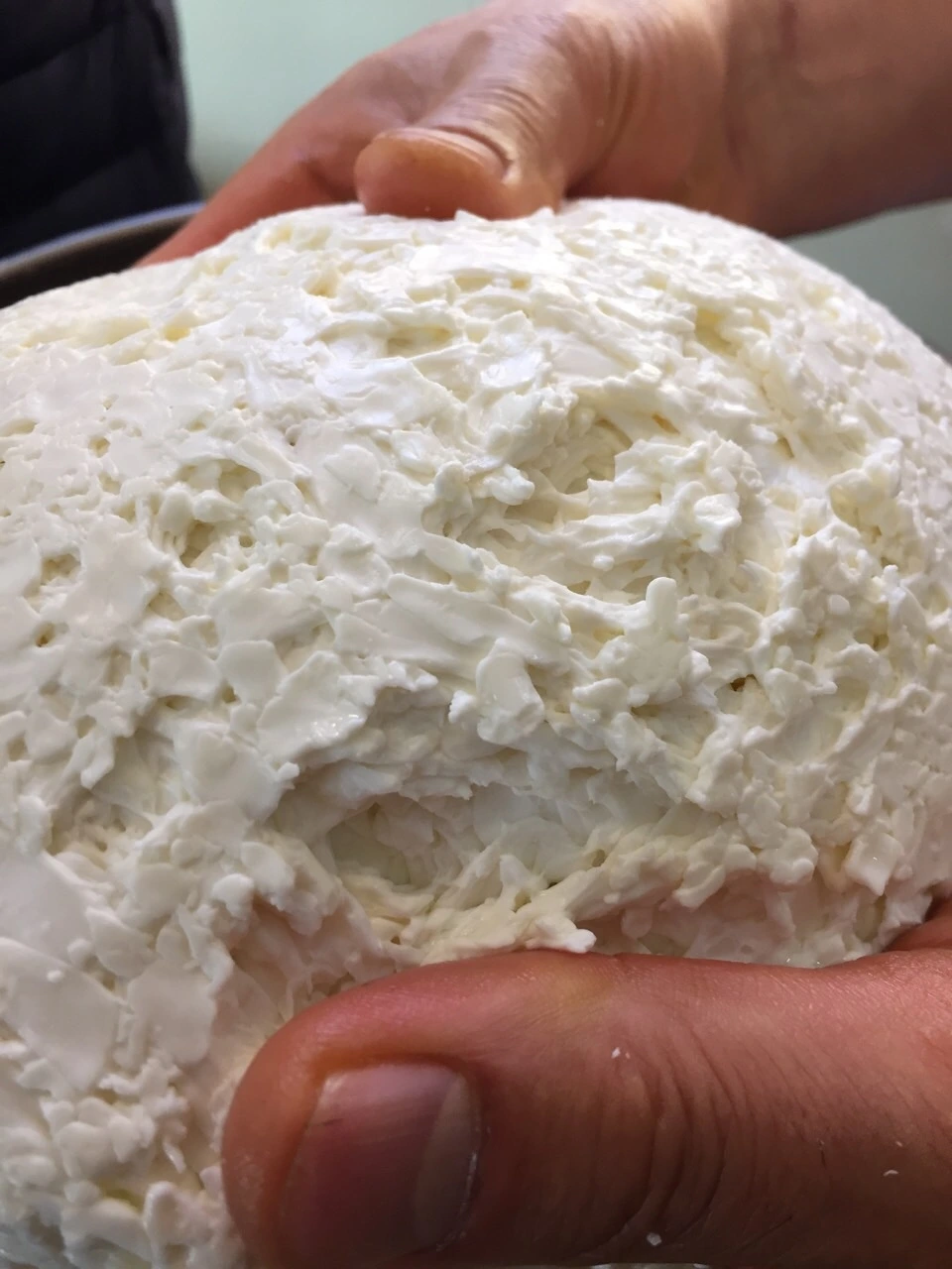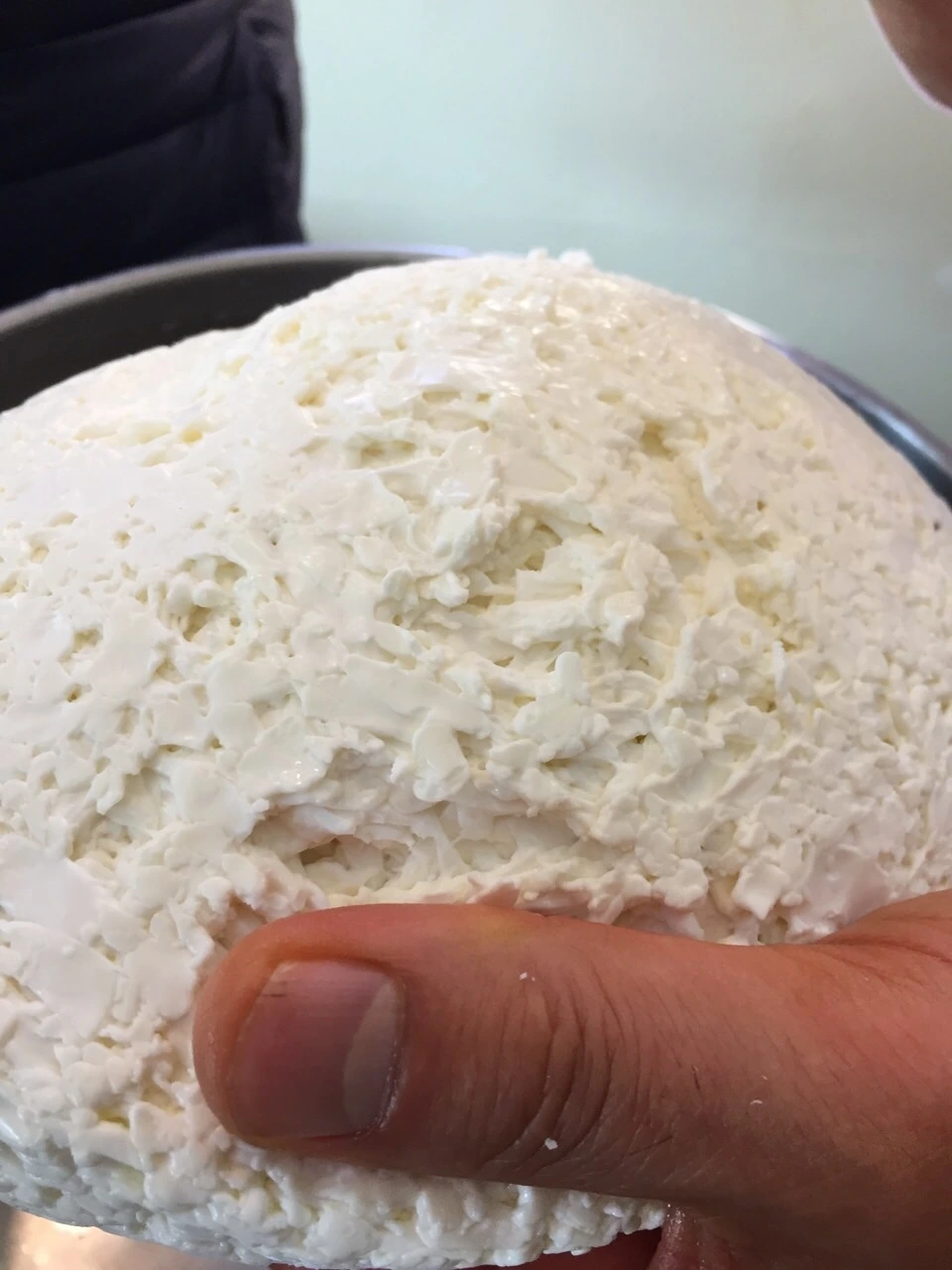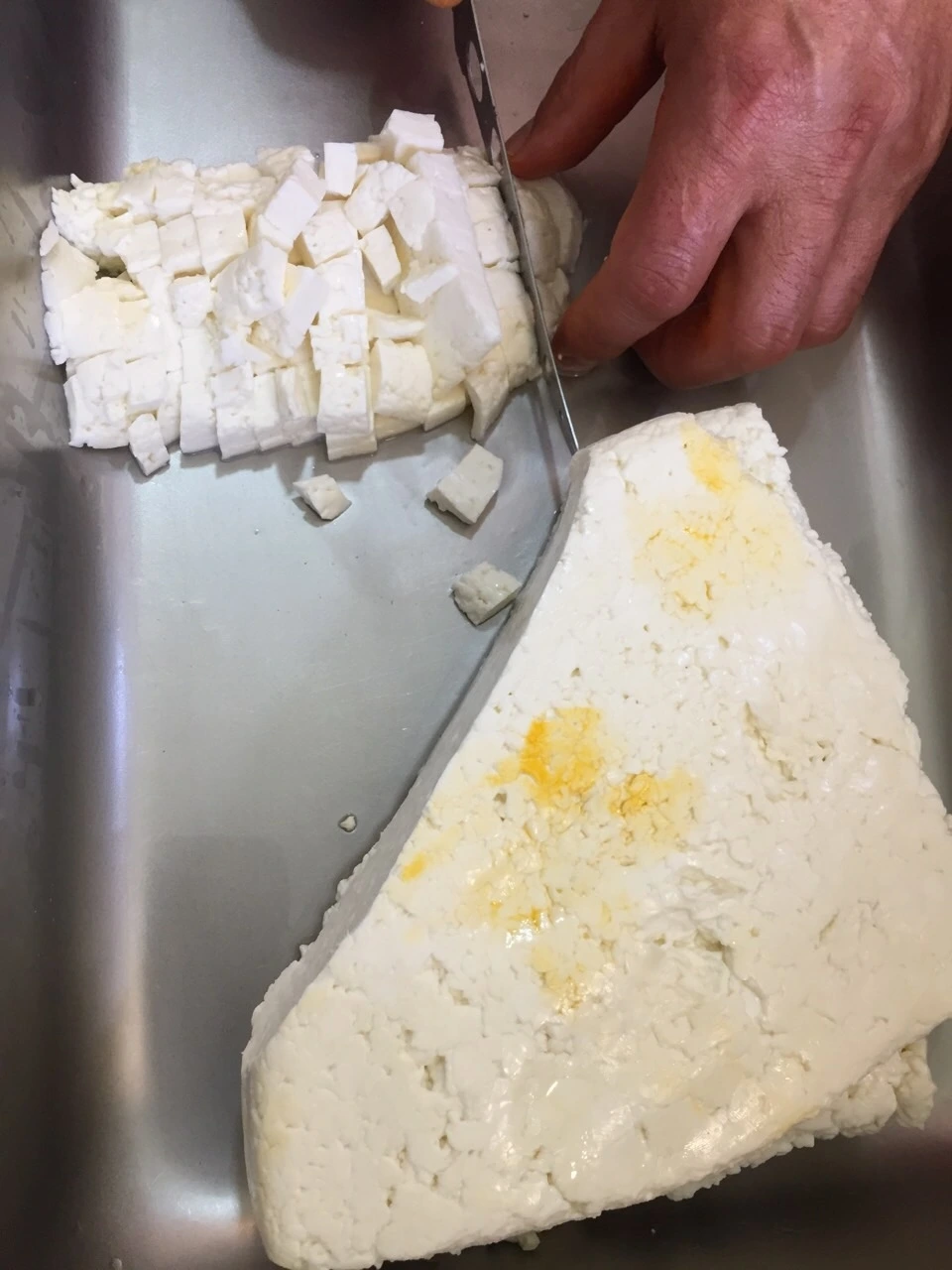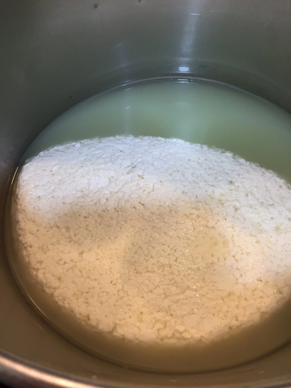 11. 체더링 한다. 온도는 중탕수 39°C 를 유지한다. 반으로 잘라 포개고 뒤집기를 10분 간격으로 바글거리는 콩알 커드가 한덩어리로 붙을때까지 반복한다. ph 5.4까지 체다링을 진행한다.