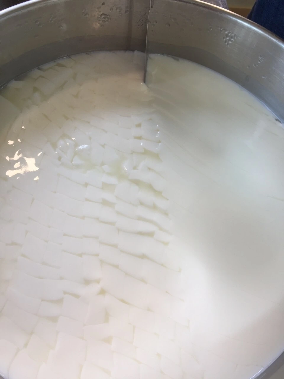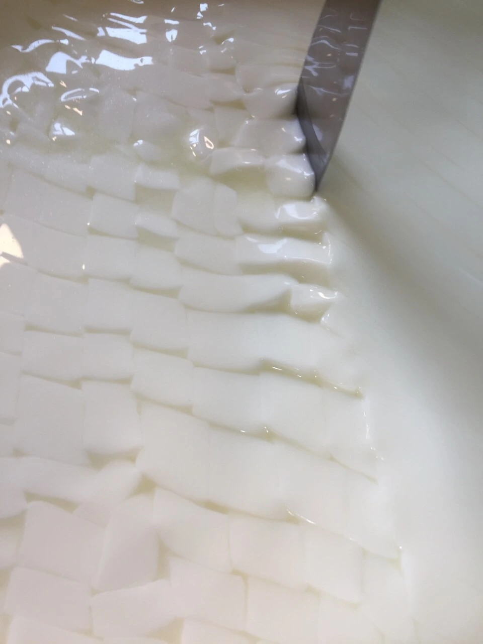 9. 39°C 를 유지한채 10분간 서서히 섞어준다. 이때 컷팅된 커드가 서로 붙지 않아야 한다.
