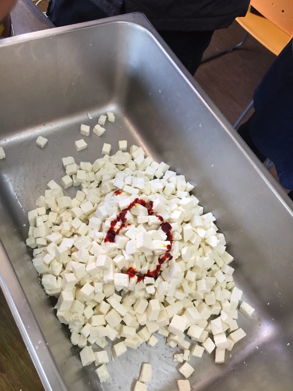 14. 체더의 상진인 색소 (안나토) 를 넣고 고루 색이 배게 섞는다.