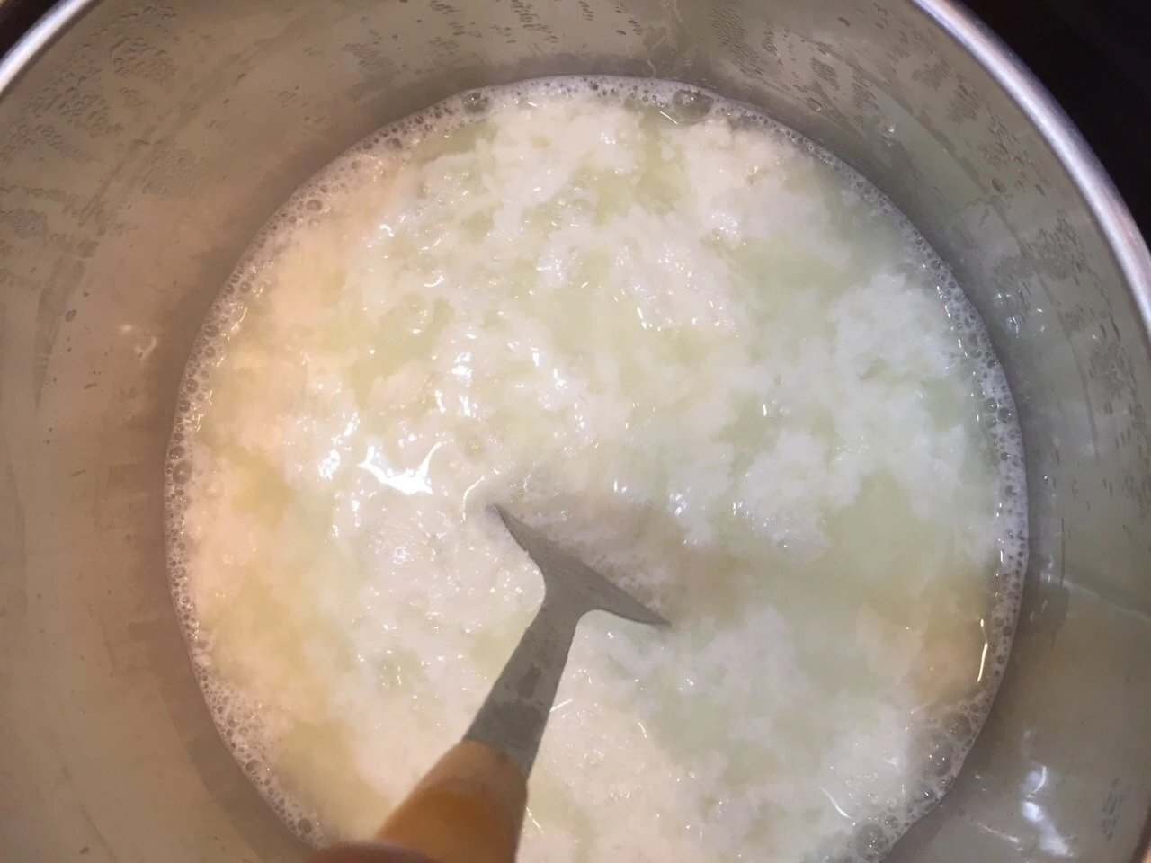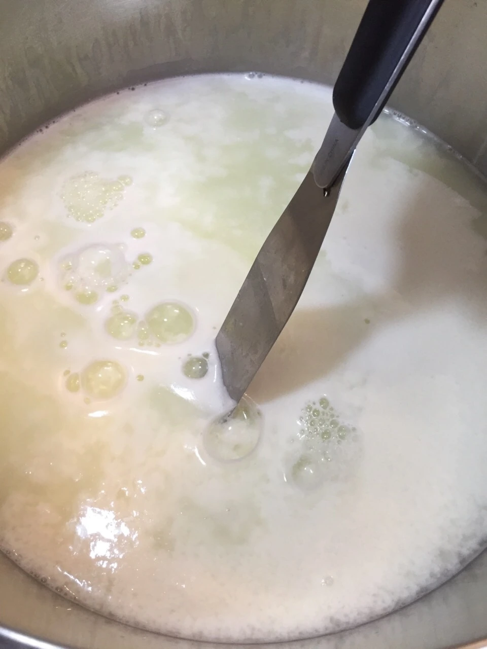 3. 스패출러를 이용해 아주 느리게 교반한다. 커드가 형성되면 5분간 정치한다.