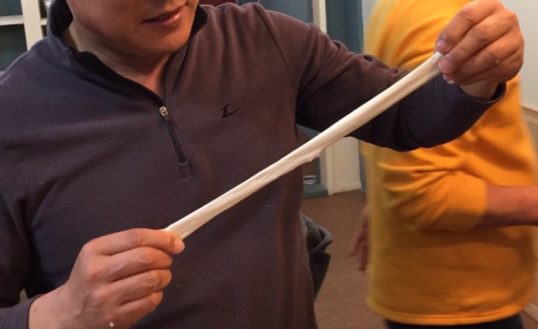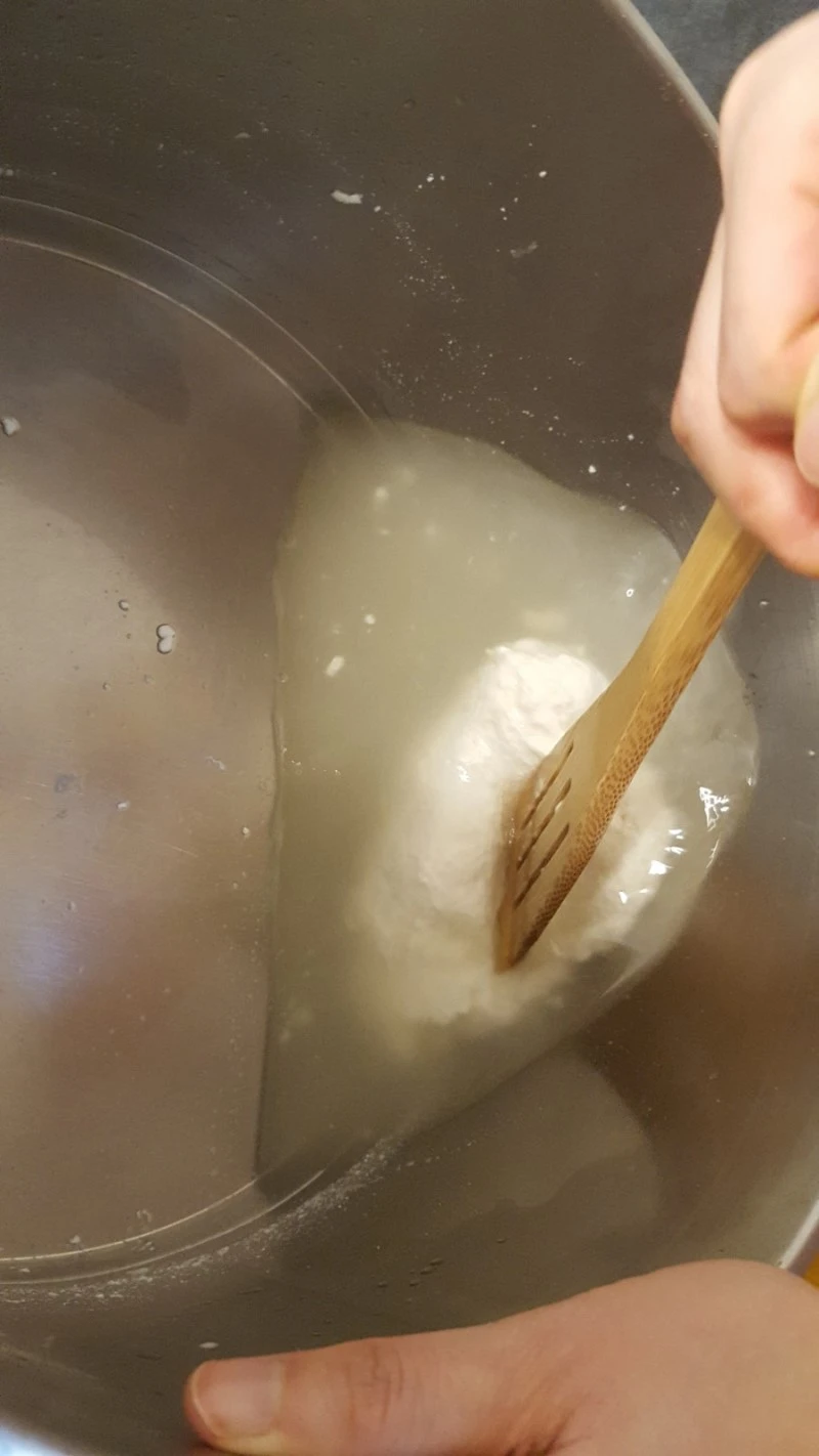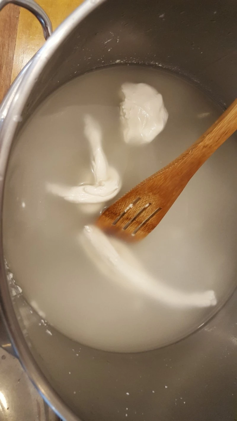 4. 스트레칭 : 85도-90도쯤되는 뜨거운 물을 커드에 넣고 반죽을 하면서 후레쉬 모짜렐라. 스트링치즈로 만들어 본다.
