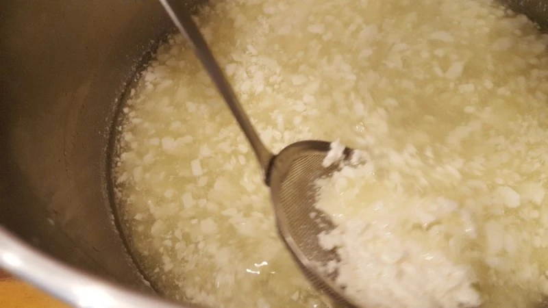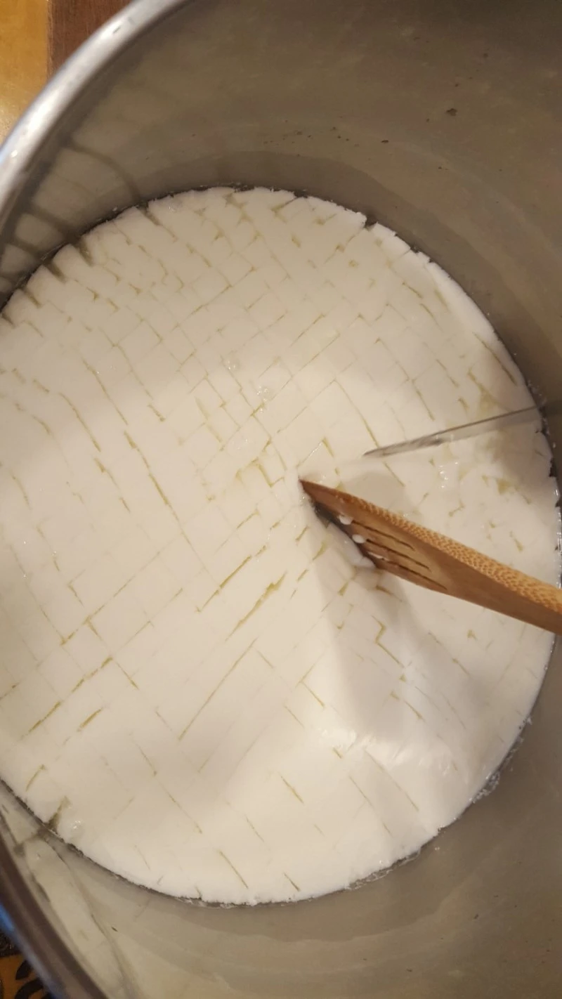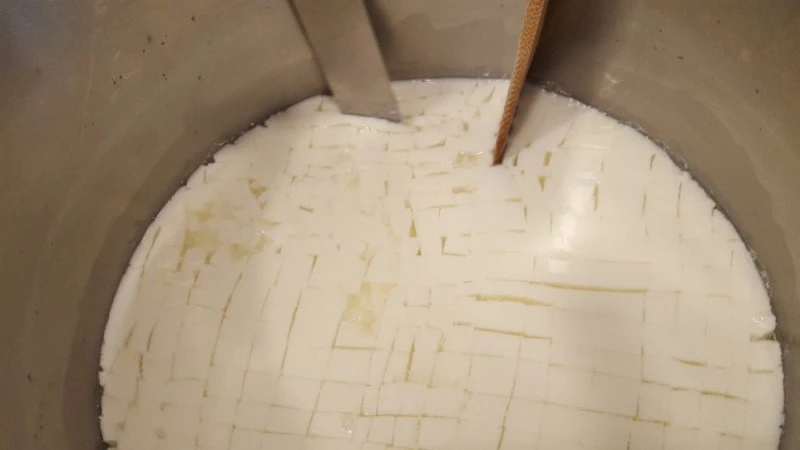 3. 커드 : 우유가 응고된 것을 확인하고 은행알 크기로 잘라주고 1분간 정치한다.