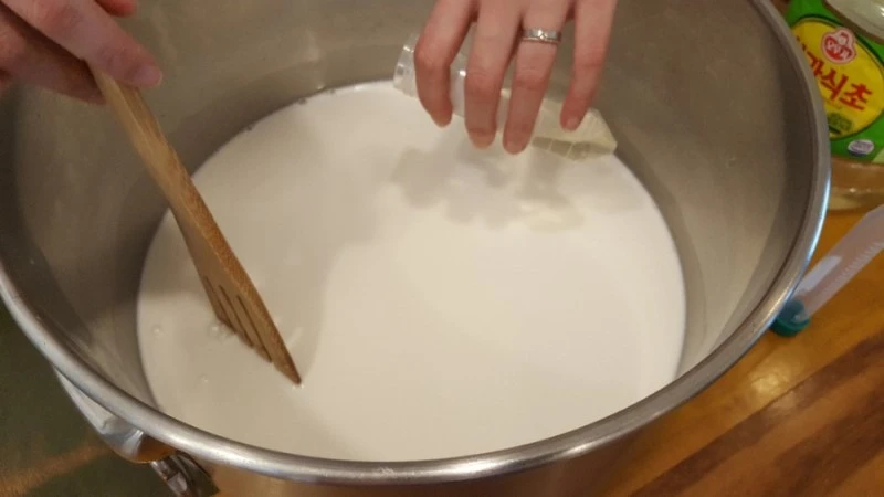 7. 5분간 교반(천천히 저어준다) 하면서 유청이 잘 배출되도록