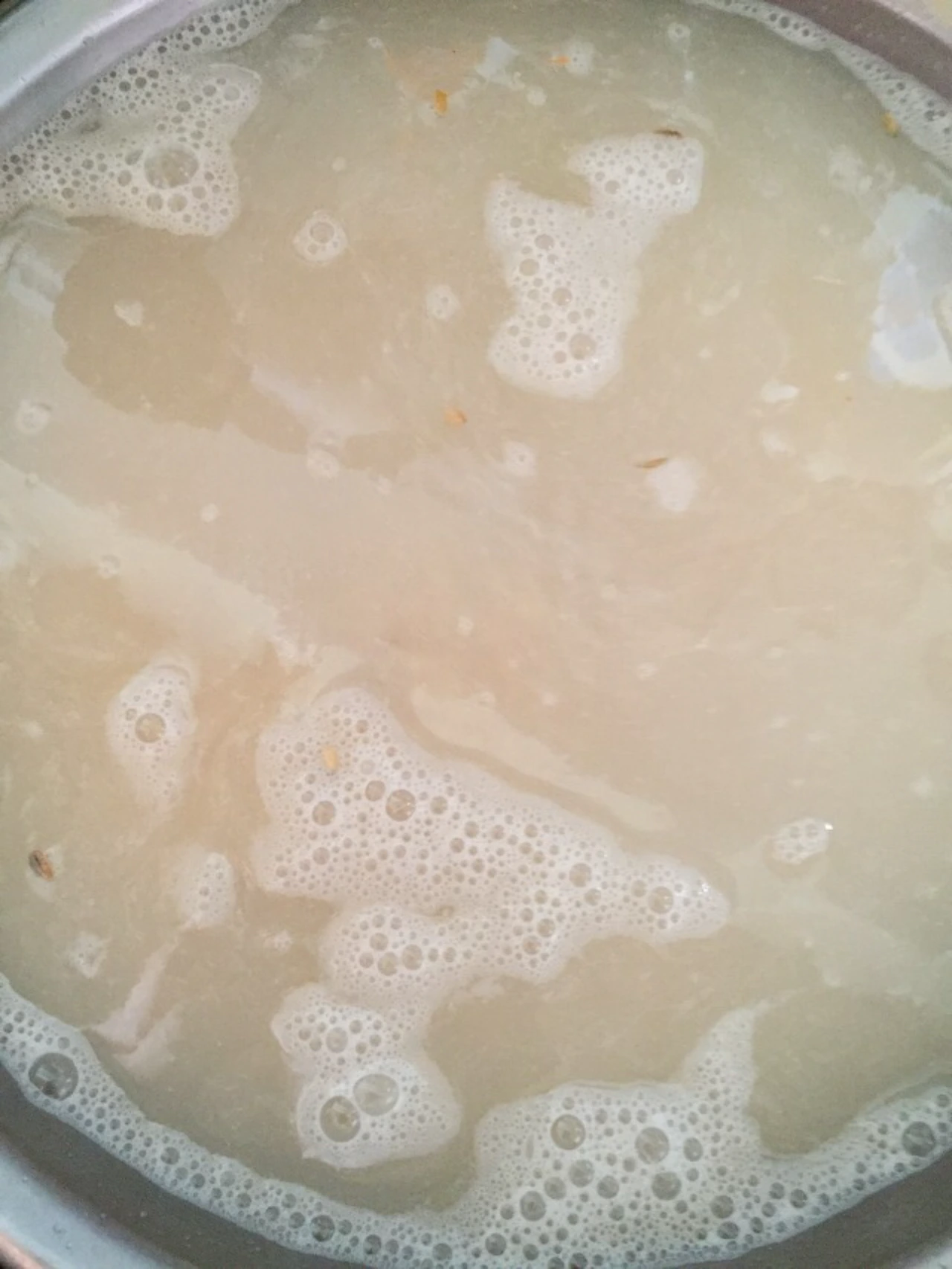 해당 쌀을 씻은 첫번째 뜨물이다. 이물질이 뜨고 냄새가 나고 혼탁한 물이다. 많은 물로 여러차례 씻어도 혼탁한 물이 맑아지지 않는다. 혼탁한 물이 쌀에 흡수 될까봐 체를 이용해서 물에 체를 넣어 흔들어 빼는 방식으로 씻었다. 수 차례를 반복하고서도 아주 맑아지지는 앖았다.