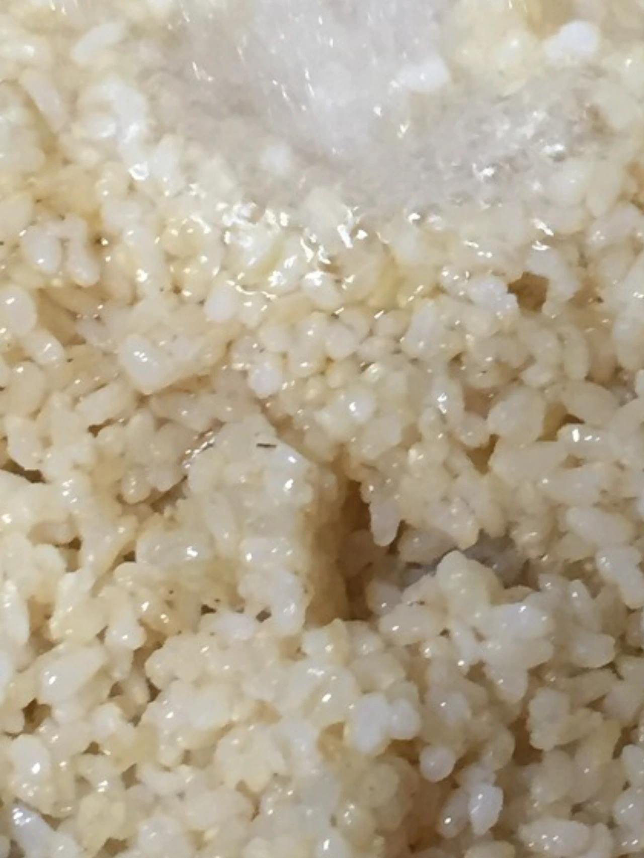 고두밥을 푸자마자 물에 씻어 온도를 내렸다. 역시 밥 배아 부분의 변색은 더욱 두드러져 보였다.