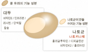 낫토는 원료가 되는 콩과 마찬가지로, 필수 아미노산을 균형있게 함유하는 양질의 단백질이나 지질, 칼슘이 풍부합니다. 갱년기 장해의 개선 효과를 기대할 수 있는 대두 이소플라본이나, 기억력 향상이나 치매 예방에 작용하는 레시틴등을 포함한 낫토의 효과가 단품 필수 메뉴로 지속되고 있는 이유이기도 합니다. 또한 끈적끈적한 점성 물질인 단백질분해효소 낫토나아제에는 혈액을 맑게 하는 작용이 있다고 합니다.