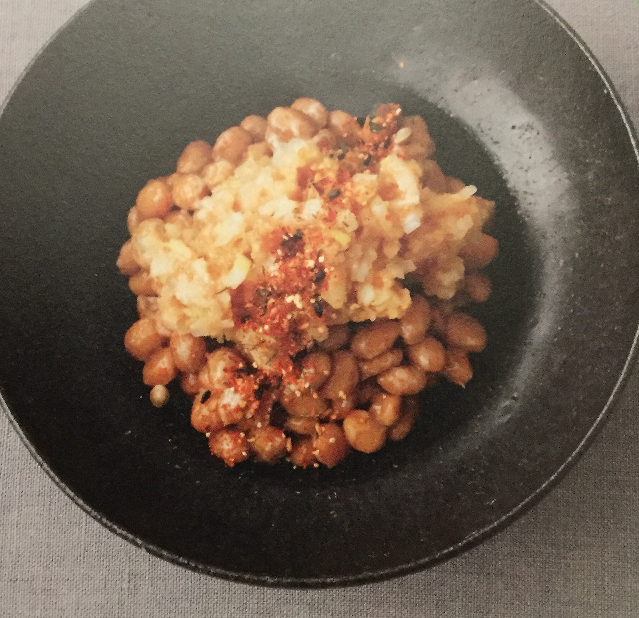 2. 용기에 낫토를 담고, 파된장을 얹고, 칠미고추를 약간 뿌린다.