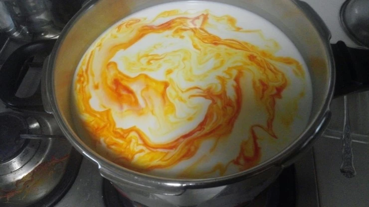 우유를 중탕으로 32도로 올립니다. 이때 30도 에서 불을 꺼서 32도 이상 올라가지 않도록 온도를 잘 맞춥니다. 준비한 아나토를 넣고 잘 젓습니다. 칼슘 클로라이드 를 넣고 잘 저은 후, 중온성 유산균을 넣고 2분정도 기다린후 국자로 30회정도 천천히 저은후 60분 뚜껑을 덮고 둡니다.