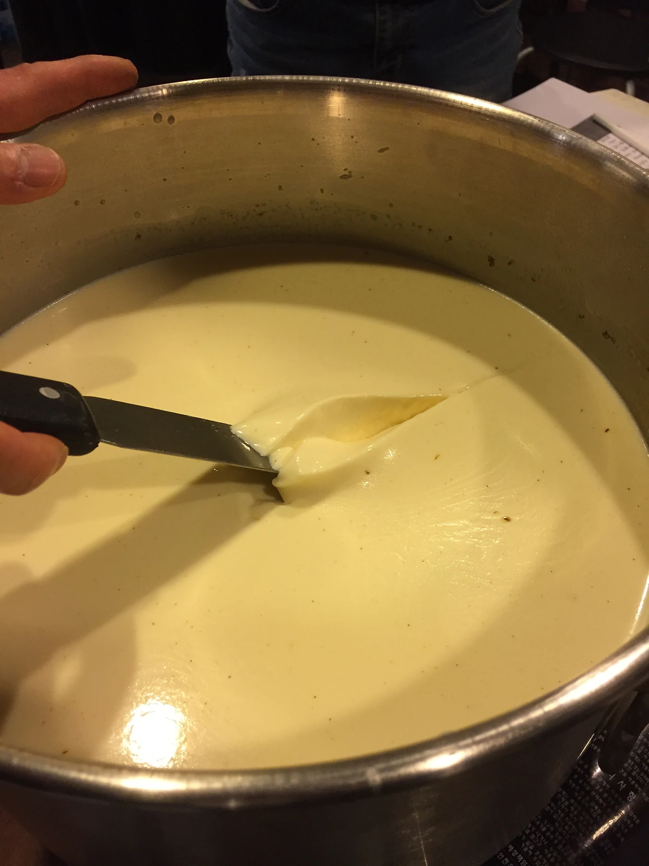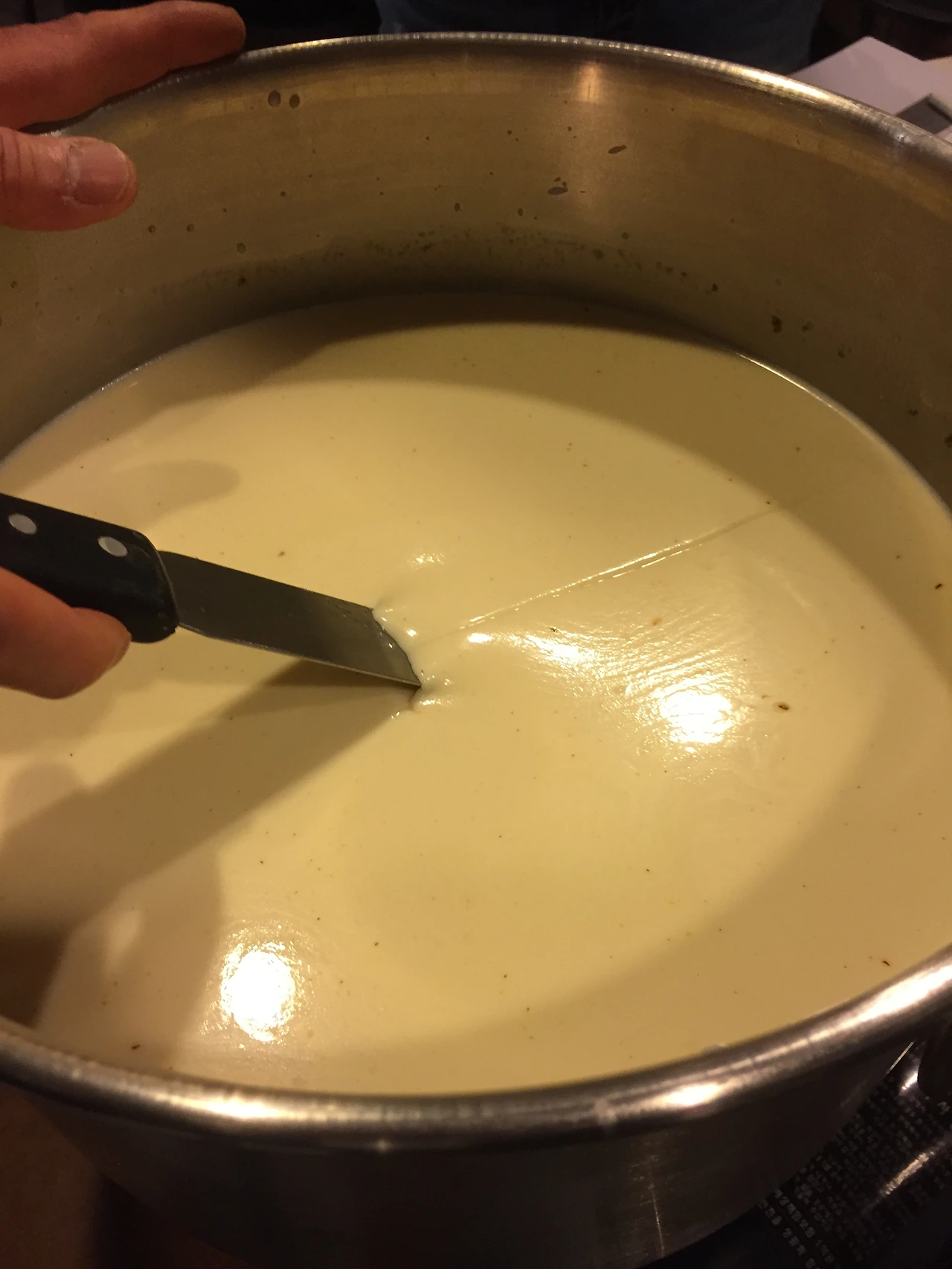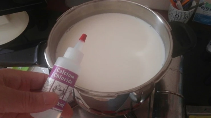 준비한 렌넷을 넣고 30회 정도 국자로 천천히 저은후 뚜껑을 덮고 60분 기다립니다. 커드가 만들어진 단단한 상태를 확인후, 만일 부족하면 30분 정도 더 기다립니다.