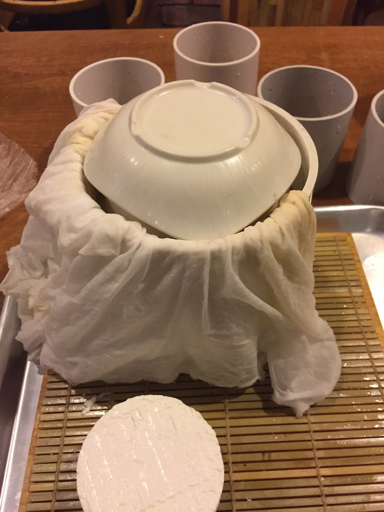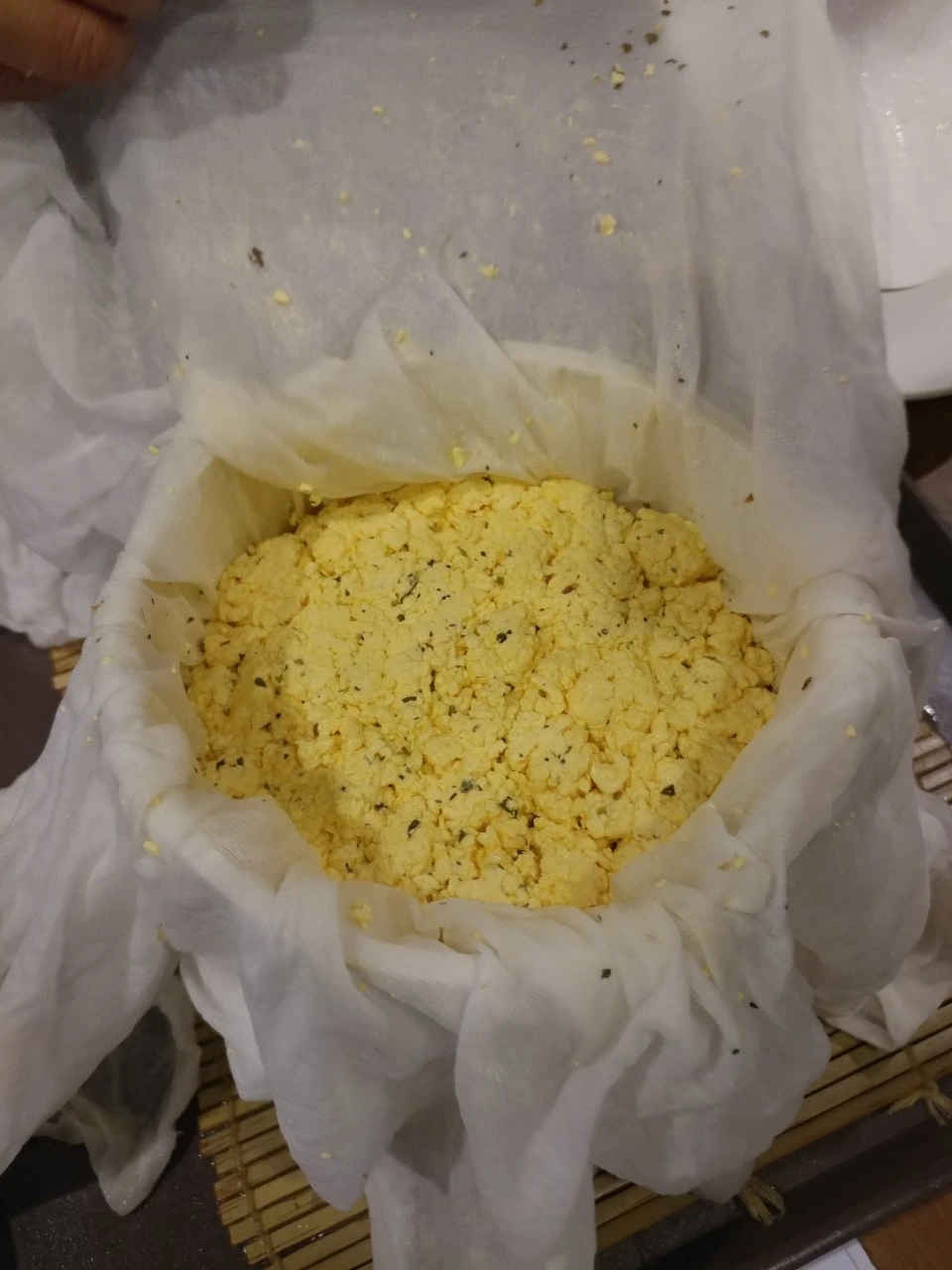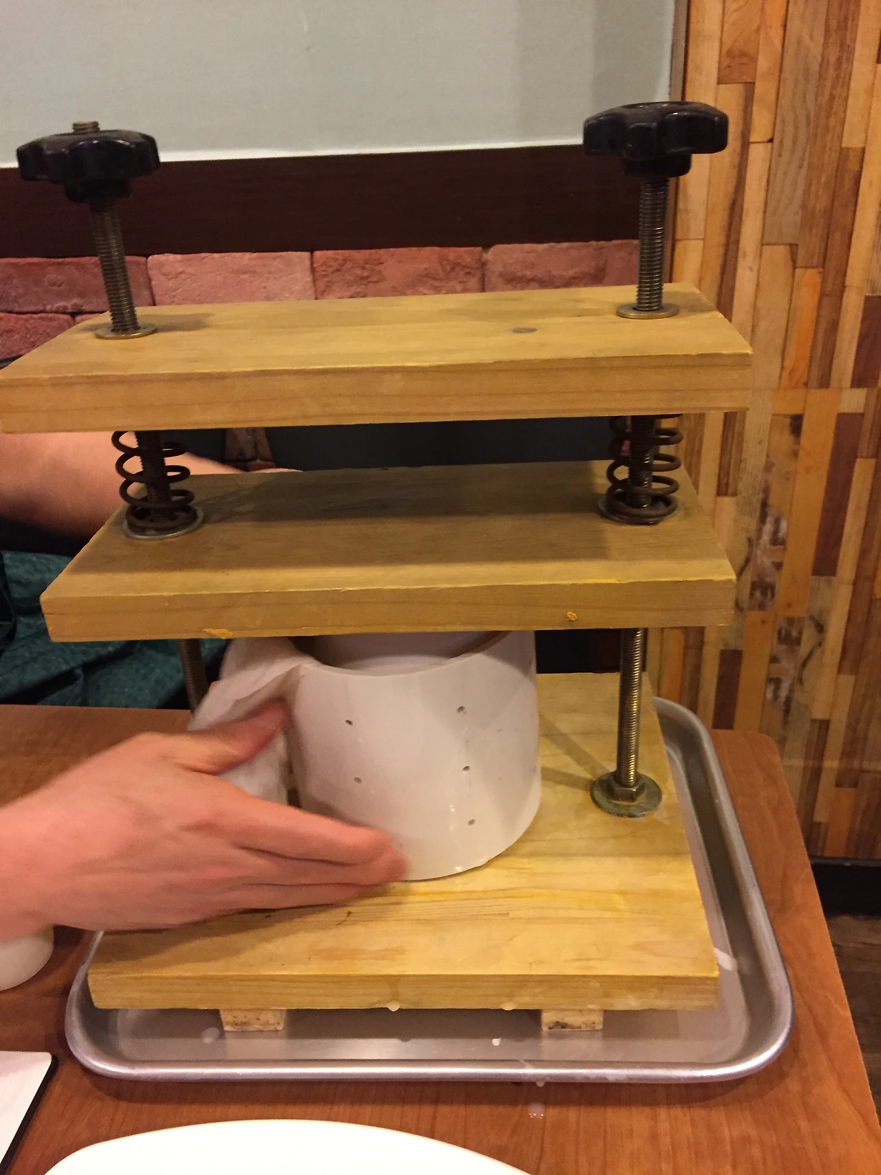 몰드에 면보를 걸치고 만들어진 커드를 담아 모양을 만듭니다. 프레스를 이용해 성형합니다.