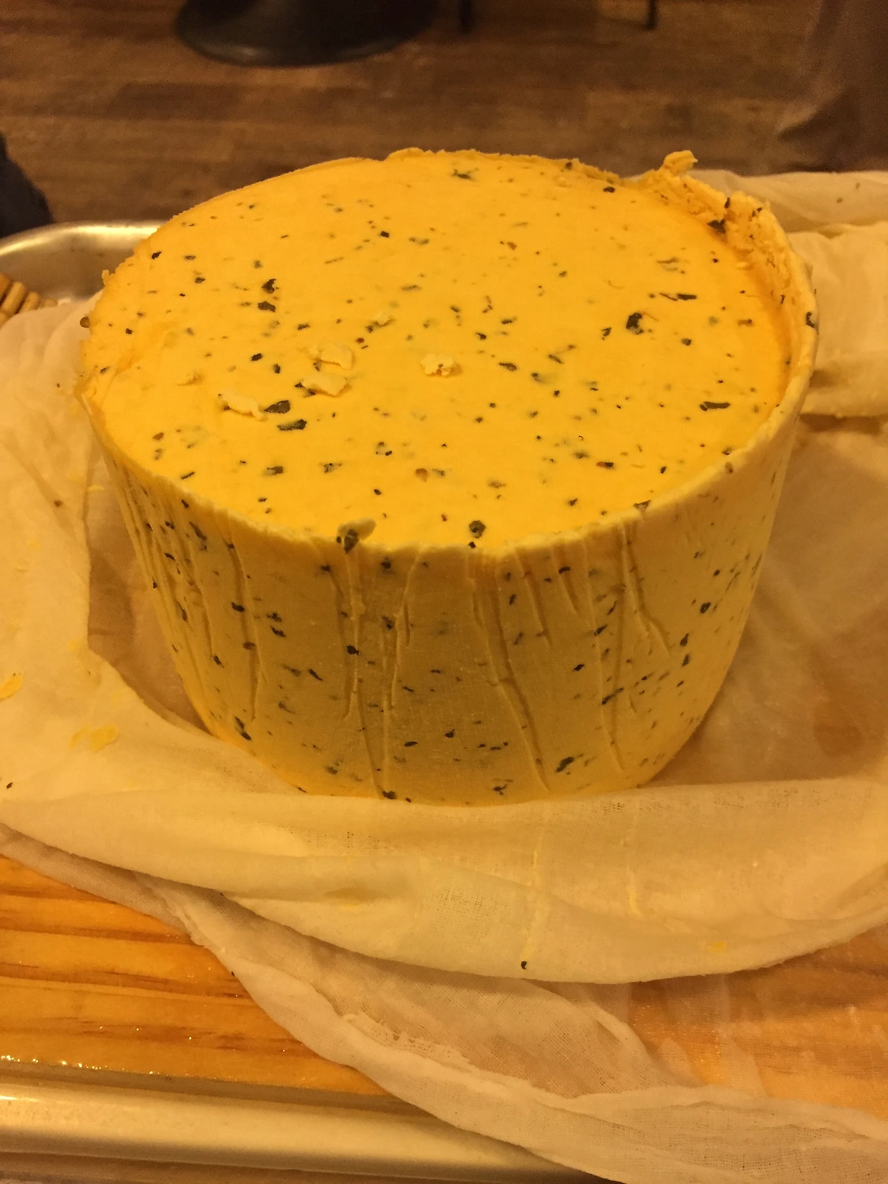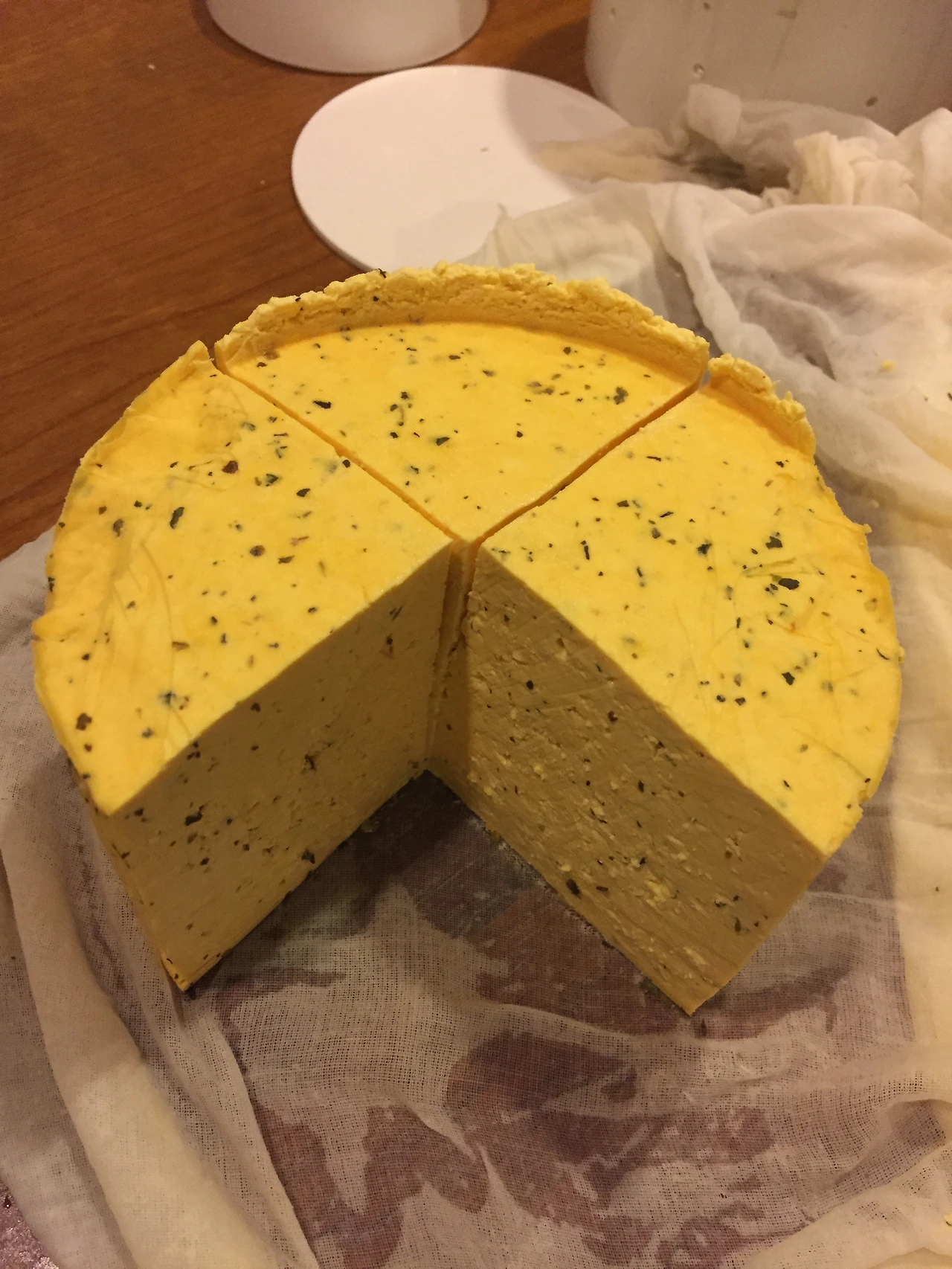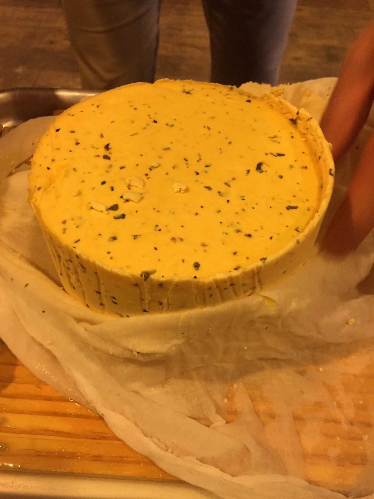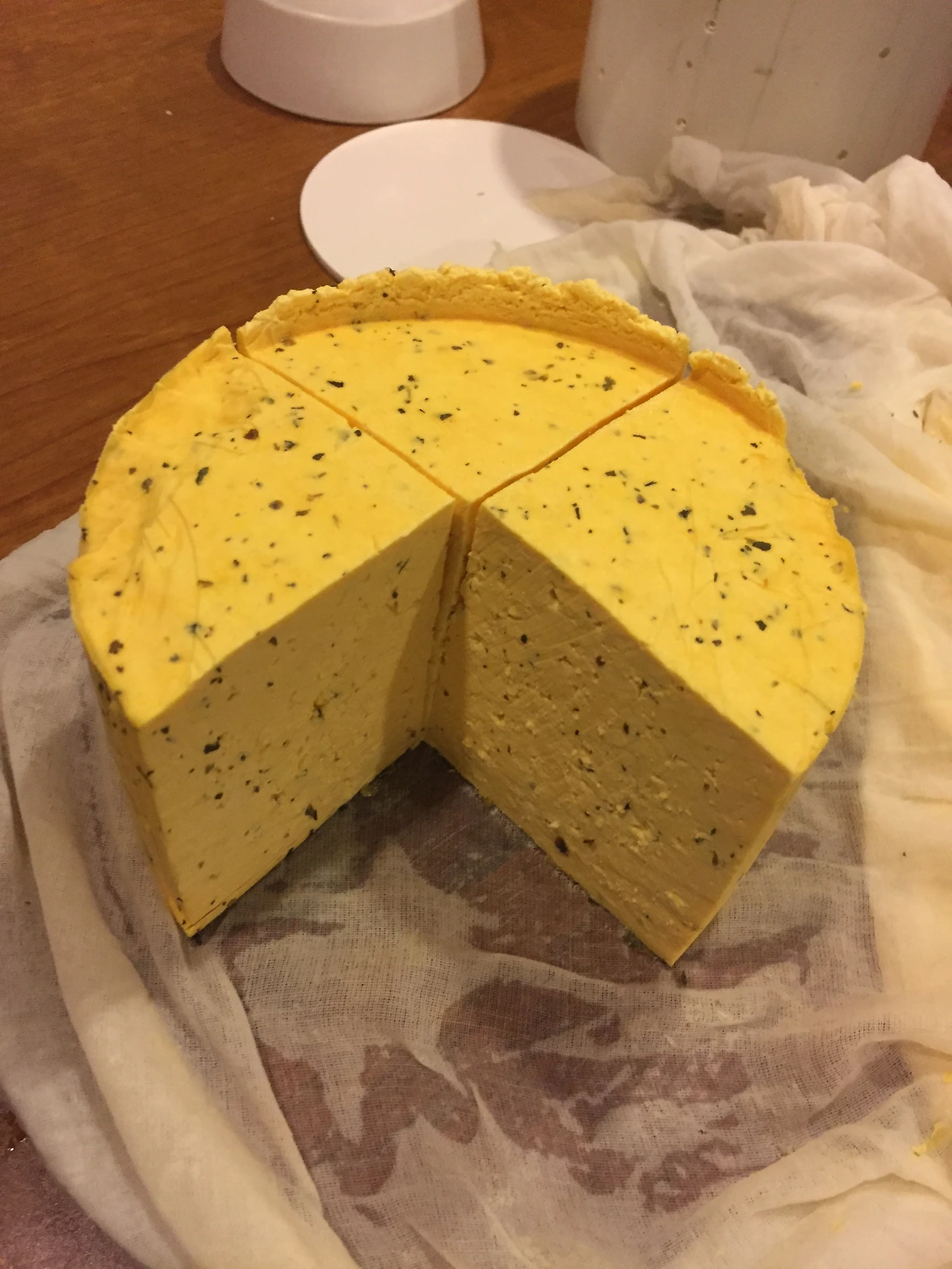몰드에 면보를 걸치고 만들어진 커드를 담아 모양을 만듭니다. 프레스를 이용해 성형합니다.