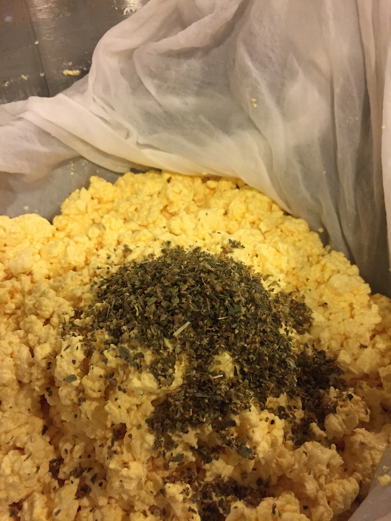 뭉친 커드를 밤톨크기로 작게 자른 후, 소금과 준비한 마늘가루와 허브를 넣고 고루 섞어줍니다.