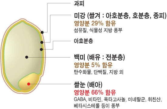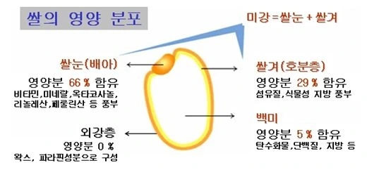 정백미(배유부)의 단백질과 지질의 분포는 균일하지 않고, 아호분층을 포함하는 외층부에 편재하고 있는 것으로 알려졌다. 정백미 전체를 가루로 만든 전립분과 정백미를 외부에서 4% 깎아 얻은 외층 분말의 조지방, 조단백질, 조회분을 측정한 결과, 모든 성분이 압도적으로 외층 분말에 많이 포함되어 있으며, 정백미에서도 외층에 많이 존재하고 있는 것을 알 수 있었다.