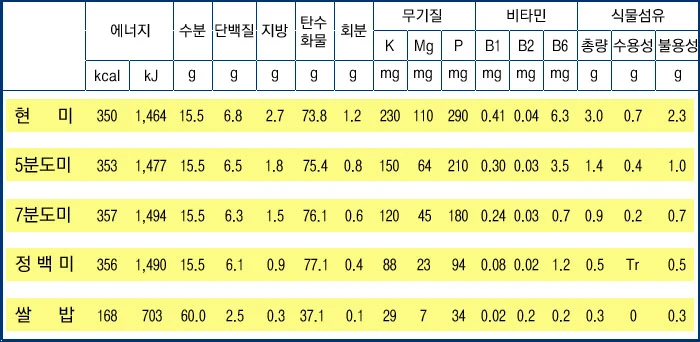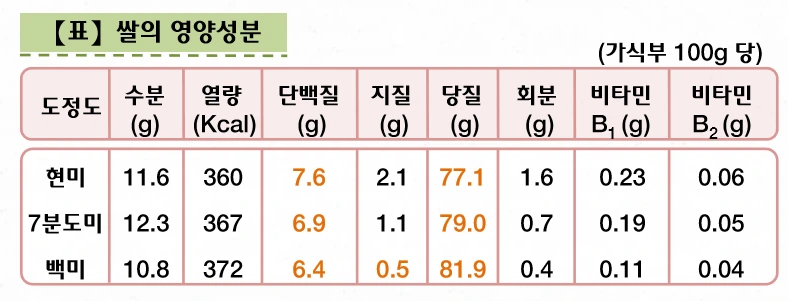 단백질이나 지방질은 쌀겨나 아호분층에 많이 존재하기 때문에 현미에서 반 정미 쌀, 7분 정미 쌀, 정백미와 도정도를 올려 쌀겨의 제거율을 높여 가면, 단백질, 지질 등의 함량이 감소한다. 현미에서는 6.8%이던 단백질이 정백미에서는 6.1%로, 2.7%였던 지방질이 0.9%로 각각 감소하고, 상대적으로 탄수화물(쌀의 경우 전분)의 함량이 높아진다.