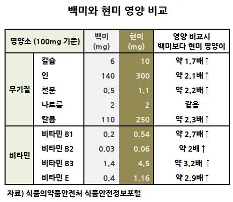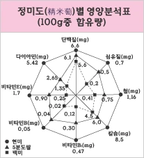 쌀은 PFC 밸런스는 단백질(P), 지질(F)과 탄수화물(C)에서 섭취할 칼로리가 각각 12~15% : 20~25% : 60~68%의 비율로 영양학적으로 아주 이상적인 식품으로 알려져 있다. 쌀의 주성분인 전분은 현미에는 약 74% 정도이지만, 쌀겨를 제거한 정백미에서는 약 77%가 된다.