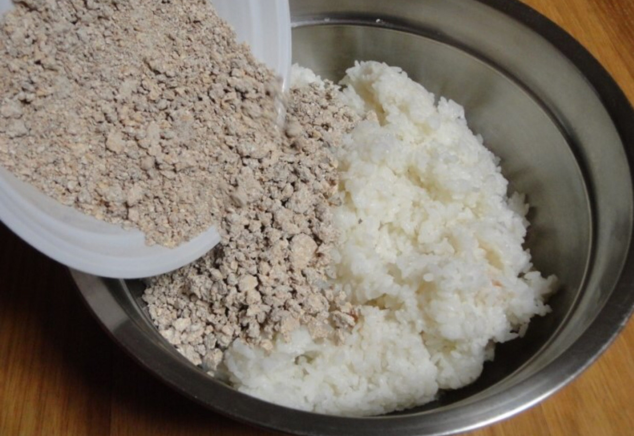 5 고두밥, 누룩, 물을 고루 섞어 용기에 담는다.