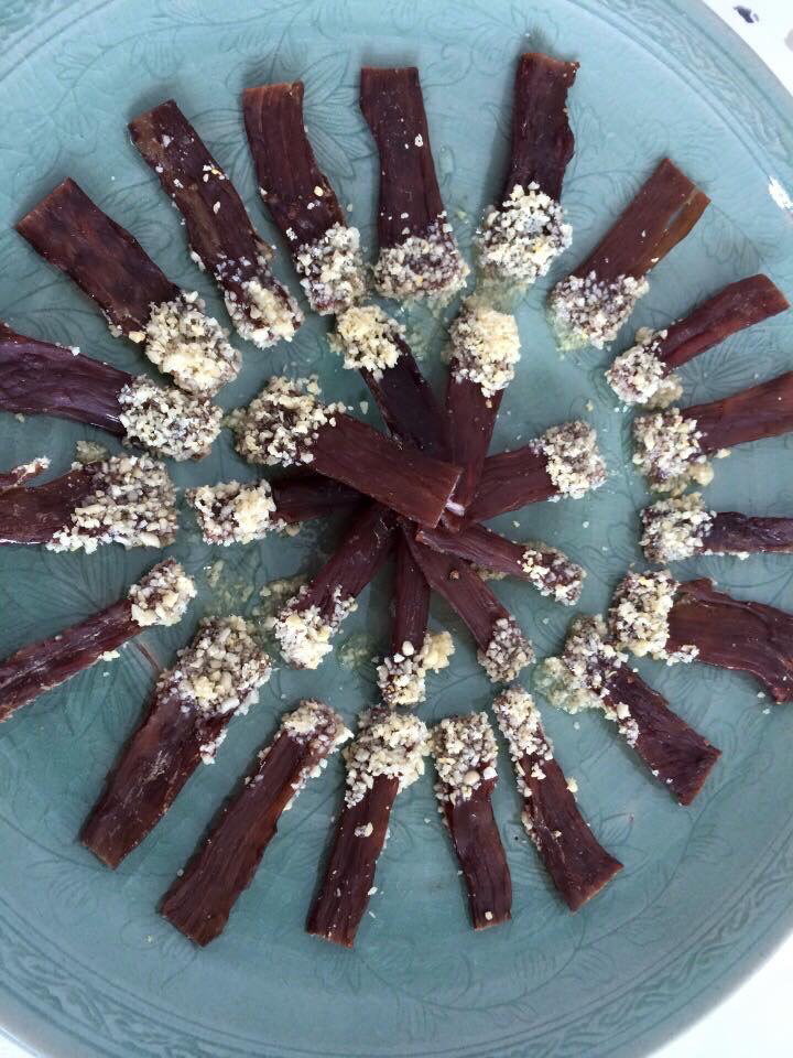 이화주만의 안주로 선택한 것이 육포, 어란이다. 급하게는 두부.