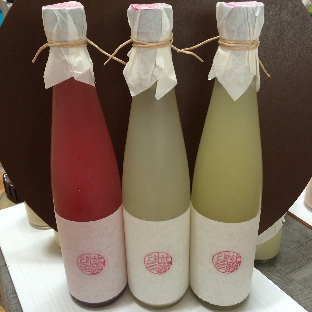 오행으로 이화주 색을 내면서는 알콜에 의해 갈변되는 현상에 당황했다. 수 많은 색 막걸리, 색 전통주가 사용하는 첨가물을 공부하게 되었다. 이화주는 알콜 갈변에 안정적인 색이다. 노랑은 유자, 빨강은 딸기나 장미, 초록은 녹차, 검정은 커피(요즘 커피 막걸리가 나오더라). 이 외에도 알콜에 안정적인 색을 찾았다. 보라색을 품은 알콜이 가능하다는 것이다.