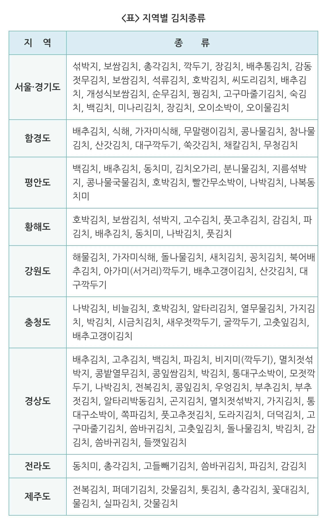 지역별 김치