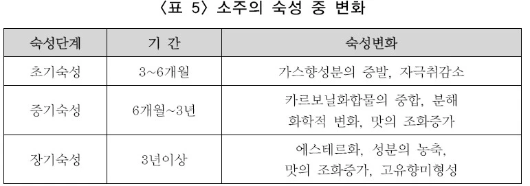 (표 5)는 소주의 숙성중의 변화를 나타낸 것으로 3단계로 나누어 볼 수 있다. 초기숙성은 가스향 성분을 제거시켜 자극적인 향을 감소시키는데 목적이 있으며, 일반적인 소주는 이 단계에서 출하된다. 중기숙성은 소주 중의 카르보닐화합물이나 지방산에스테르 성분 등의 분해, 중합에 의한 변화이며, 장기저장에서는 에스테르화, 생성 향미성분의 농축, 물과 알코올의 화합에 의한 맛의 조화가 증가된다. 숙성에 있어 가장 중요한 변화는 산소에 의한 각종성분의 산화이다. 따라서 저장용기의 재질에 따라서도 많은 영향을 미치게 된다.