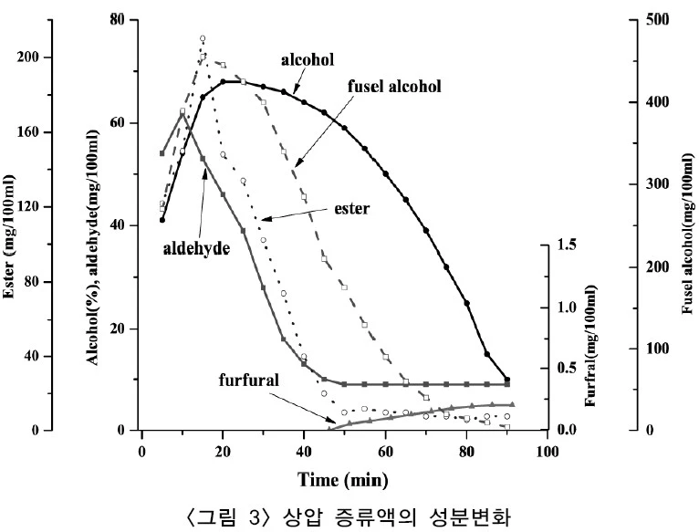 알코올은 초기에 높고 이후 점차 감소한다. 에스테르, 알데히드, 퓨젤유(고급알코올)도 증류초기에 많이 유출된다. 산과 가열에 의해서 생성되는 푸르푸랄(furfural)은 열을 많이 받는 증류후기에 증가한다. 통상, 증류초기(초류)와 증류말기(후류)는 버리는 것이 좋은 품질의 소주를 얻을 수 있다. 끝 부분(후류)는