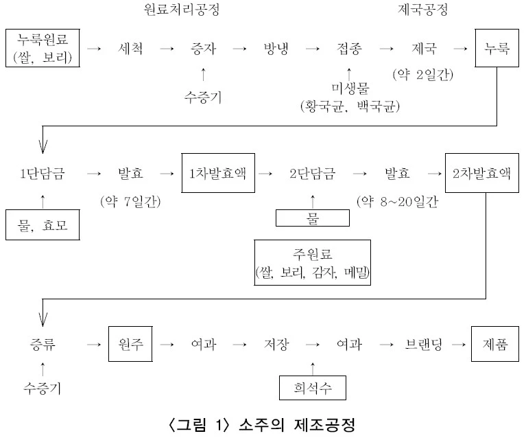 일반적인 소주의 제조공정을 (그림 1)에 나타내었다. 소주의 종류는 1차 발효후 2차 발효액에 들어가는 원료에 의해서 결정된다. 일본에서는 청주주박을 파쇄한 후 박중량의 40%정도의 물을 붓고 약 한달 동안 재발효 시킨 후 증류하는 주박소주도 있다.