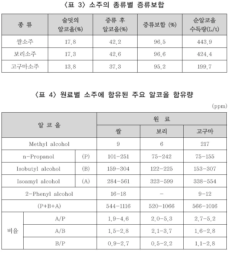 소주의 향미는 ethyl caporate, 2-phenyl alcohol, isoamyl alcohol 등의 특징적인 향기성분의 양적인 구성 이외에 n-propanol(P), isobutyl alcohol(B), isoamyl alcohol(A)의 함유비율도 제품의 특징을 결정짓는데 중요한 역할을 한다. 이들 3가지 성분의 비율은 소주의 종류별로 서로 다르다(A/P비, A/B비, B/P비). A/P비는 사탕수수, 감자 등의 과피를 가지는 원료에서 높게 나타나는 반면 도정한 곡물을 원료로 한 제품에서는 낮게 나타난다. A/B비는 누룩사용이 적은 소주(태국 등의 인디카형쌀 사용)에서 비교적 낮은 값을 나타내는 반면 황국을 사용하여 누룩사용양이 많은 것, 또는 발효물의 급수비율이 적은 소주에서 일반적으로 높게 나타난다. 쌀소주는 위스키에 비해 P가 많고 B가 매우적기 때문에 B/P비는 양주에 비해 낮은 특성이 있다(표 4).